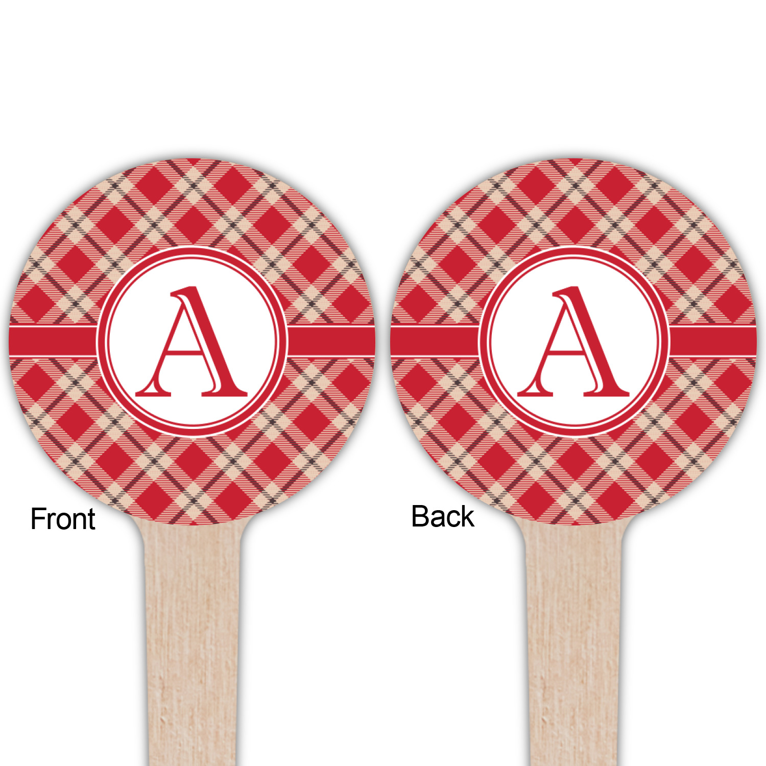 For our design, we chose a simple plaid; we chose red & tan to create a unisex palette and used dark grey for our accent color. We also chose the classic ribbon and round label with an elegant initial for our very simple, yet elegant personalization.