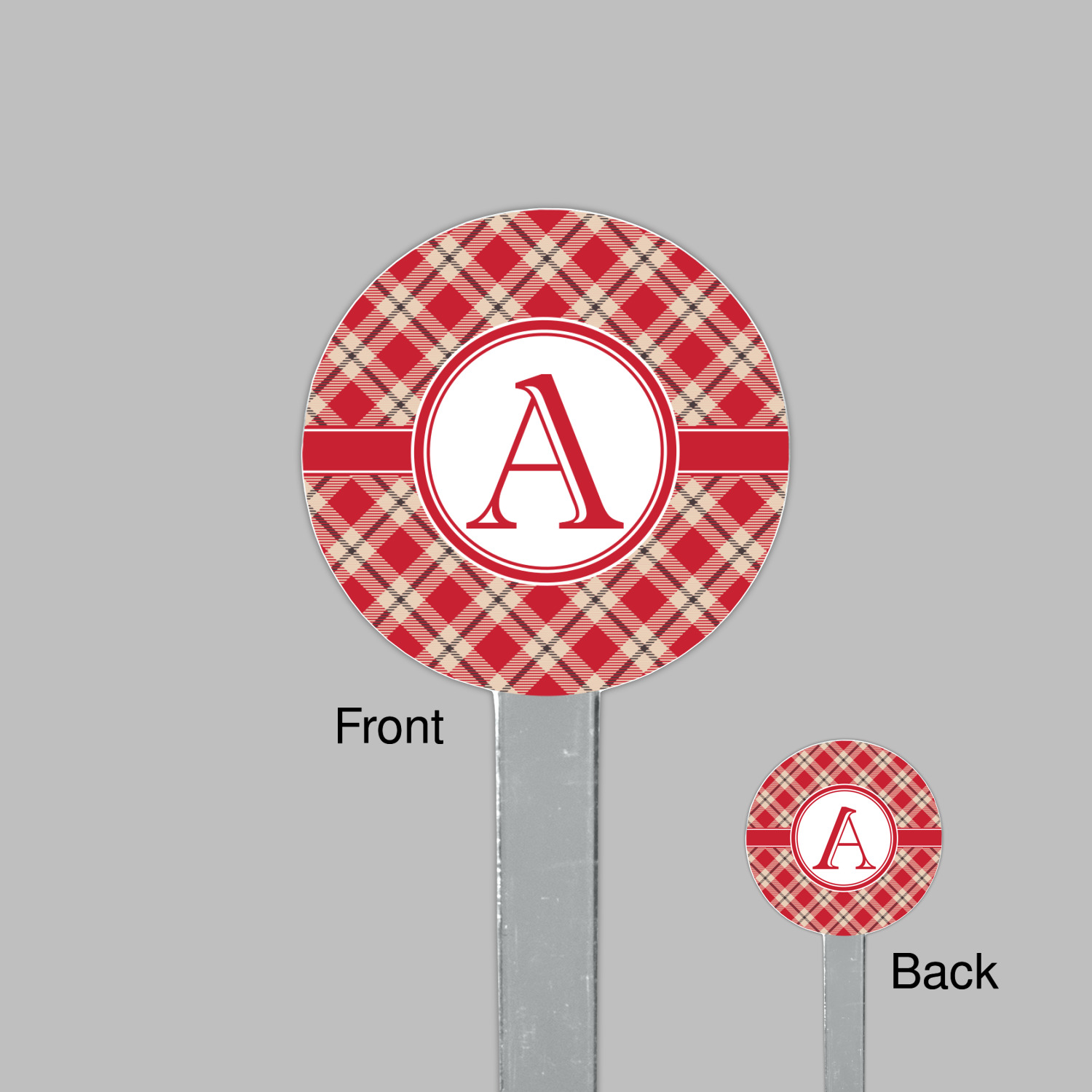 For our design, we chose a simple plaid; we chose red & tan to create a unisex palette and used dark grey for our accent color. We also chose the classic ribbon and round label with an elegant initial for our very simple, yet elegant personalization.