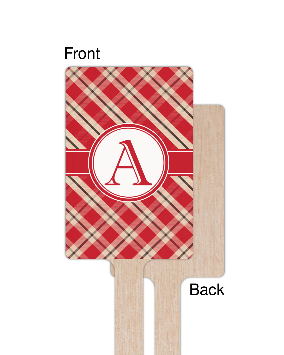 For our design, we chose a simple plaid; we chose red & tan to create a unisex palette and used dark grey for our accent color. We also chose the classic ribbon and round label with an elegant initial for our very simple, yet elegant personalization.