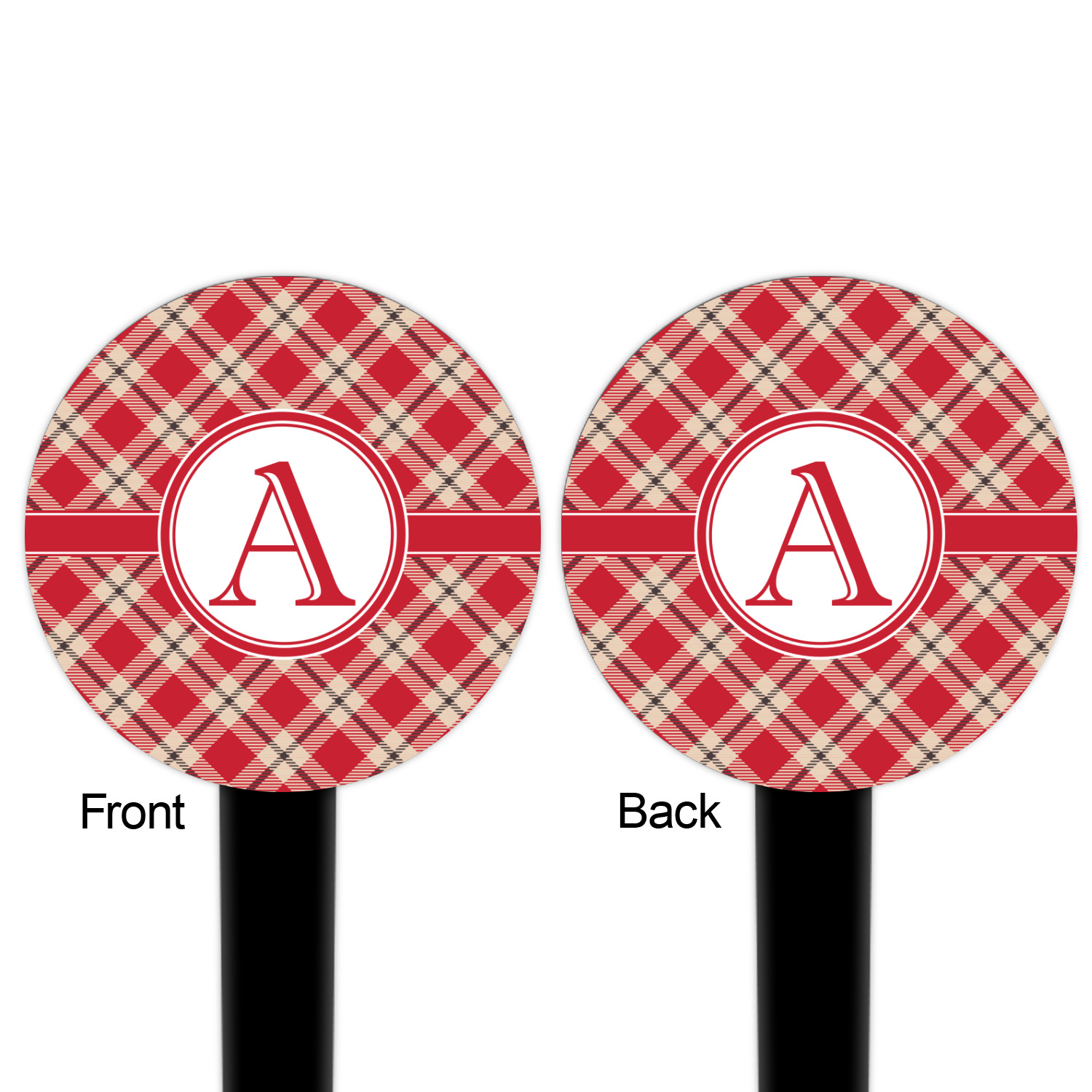 For our design, we chose a simple plaid; we chose red & tan to create a unisex palette and used dark grey for our accent color. We also chose the classic ribbon and round label with an elegant initial for our very simple, yet elegant personalization.