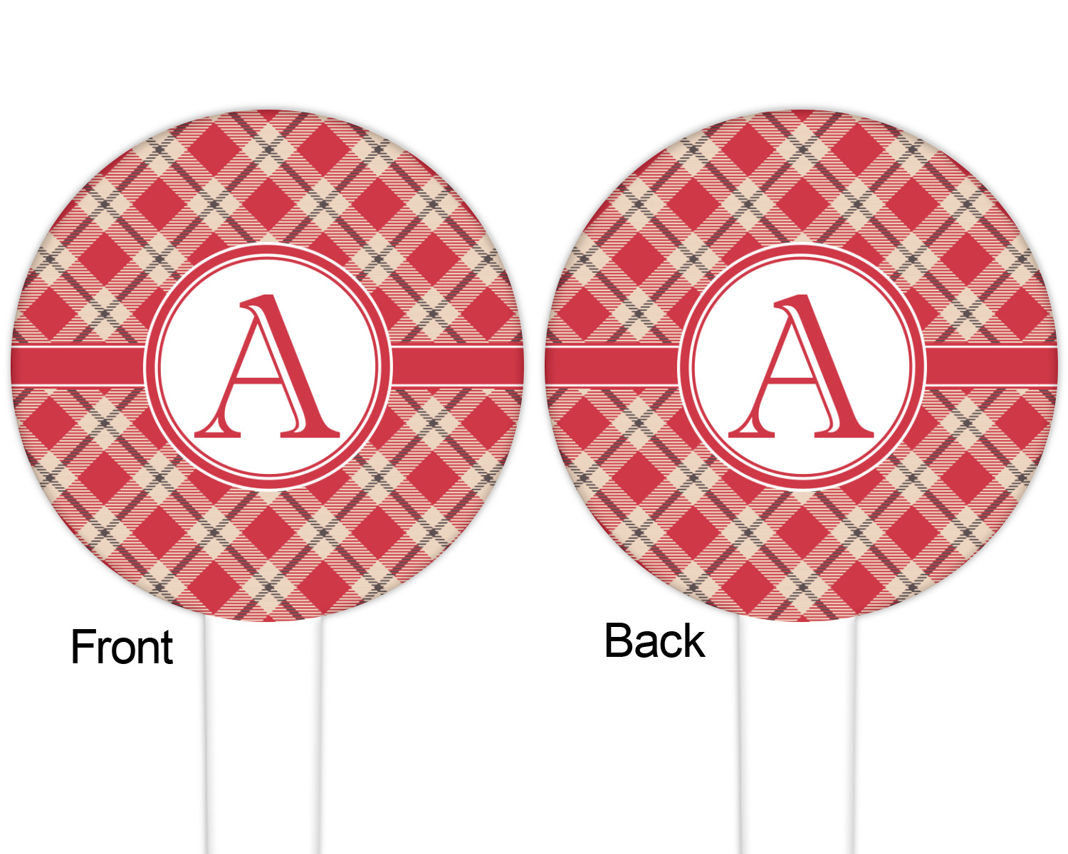 For our design, we chose a simple plaid; we chose red & tan to create a unisex palette and used dark grey for our accent color. We also chose the classic ribbon and round label with an elegant initial for our very simple, yet elegant personalization.
