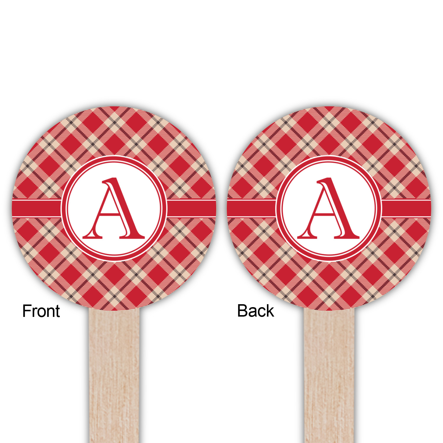 For our design, we chose a simple plaid; we chose red & tan to create a unisex palette and used dark grey for our accent color. We also chose the classic ribbon and round label with an elegant initial for our very simple, yet elegant personalization.
