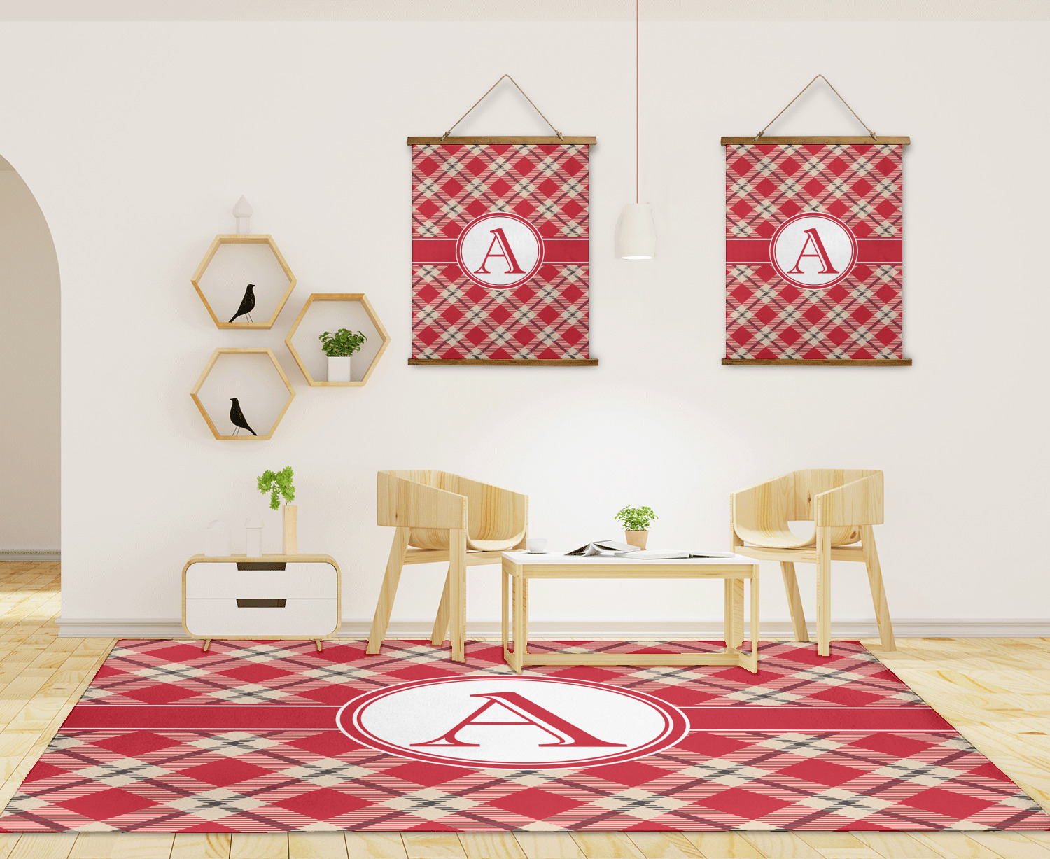 For our design, we chose a simple plaid; we chose red & tan to create a unisex palette and used dark grey for our accent color. We also chose the classic ribbon and round label with an elegant initial for our very simple, yet elegant personalization.