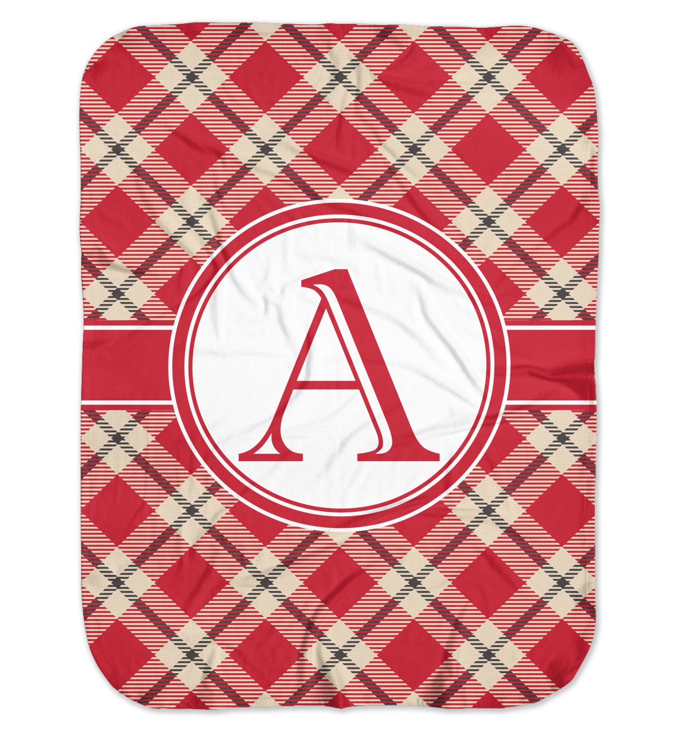 For our design, we chose a simple plaid; we chose red & tan to create a unisex palette and used dark grey for our accent color. We also chose the classic ribbon and round label with an elegant initial for our very simple, yet elegant personalization.