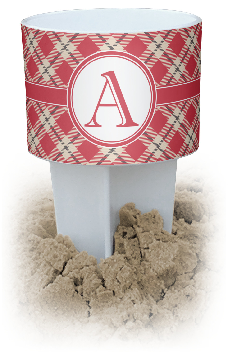 This cup holder has a large stake at its bottom that anchors it to the sand or ground below, while the cup holder rests above the stake. The entire drink holder is made of durable plastic and displays your customization around the cup holder portion. We sell these personalized beach spikers in two different colors: black and white.