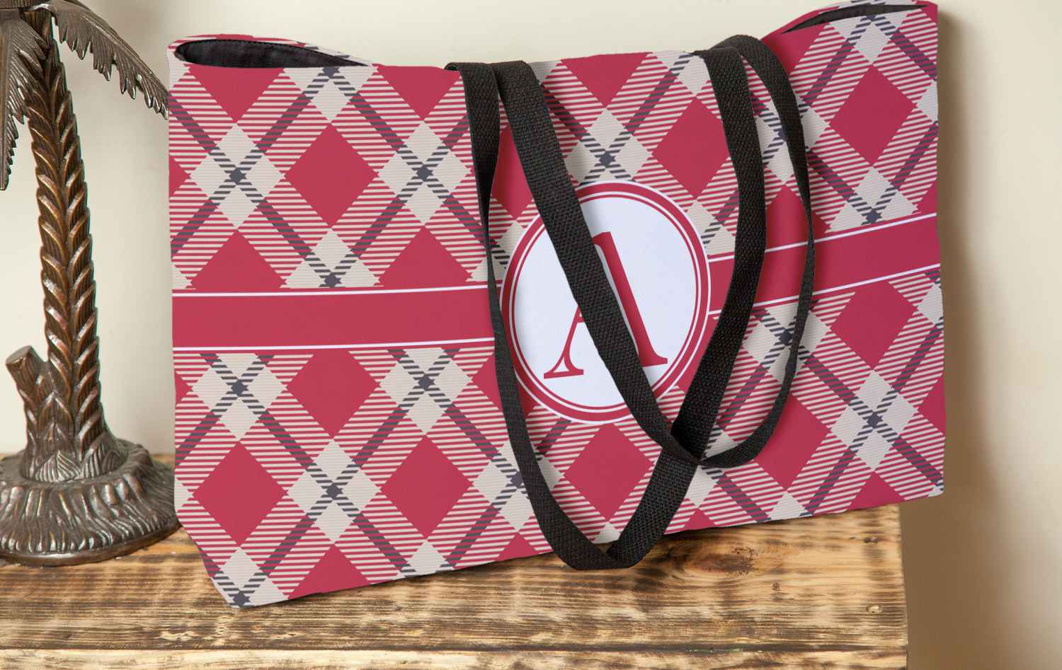 For our design, we chose a simple plaid; we chose red & tan to create a unisex palette and used dark grey for our accent color. We also chose the classic ribbon and round label with an elegant initial for our very simple, yet elegant personalization.