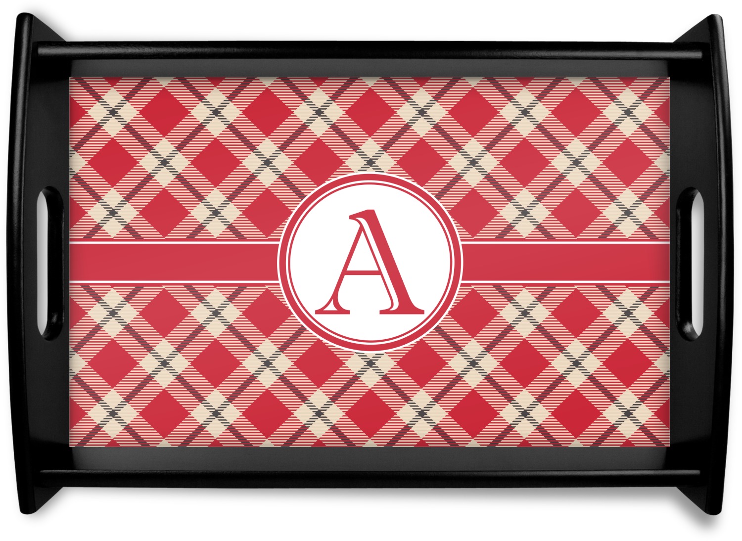 For our design, we chose a simple plaid; we chose red & tan to create a unisex palette and used dark grey for our accent color. We also chose the classic ribbon and round label with an elegant initial for our very simple, yet elegant personalization.