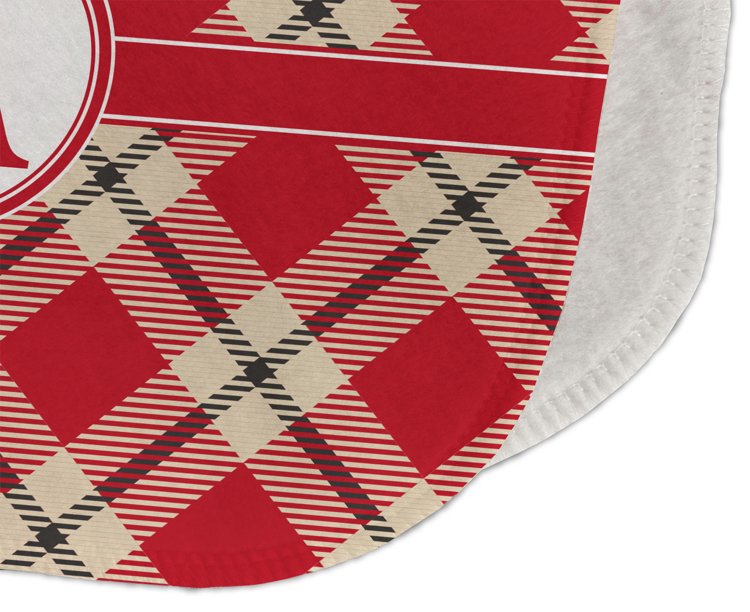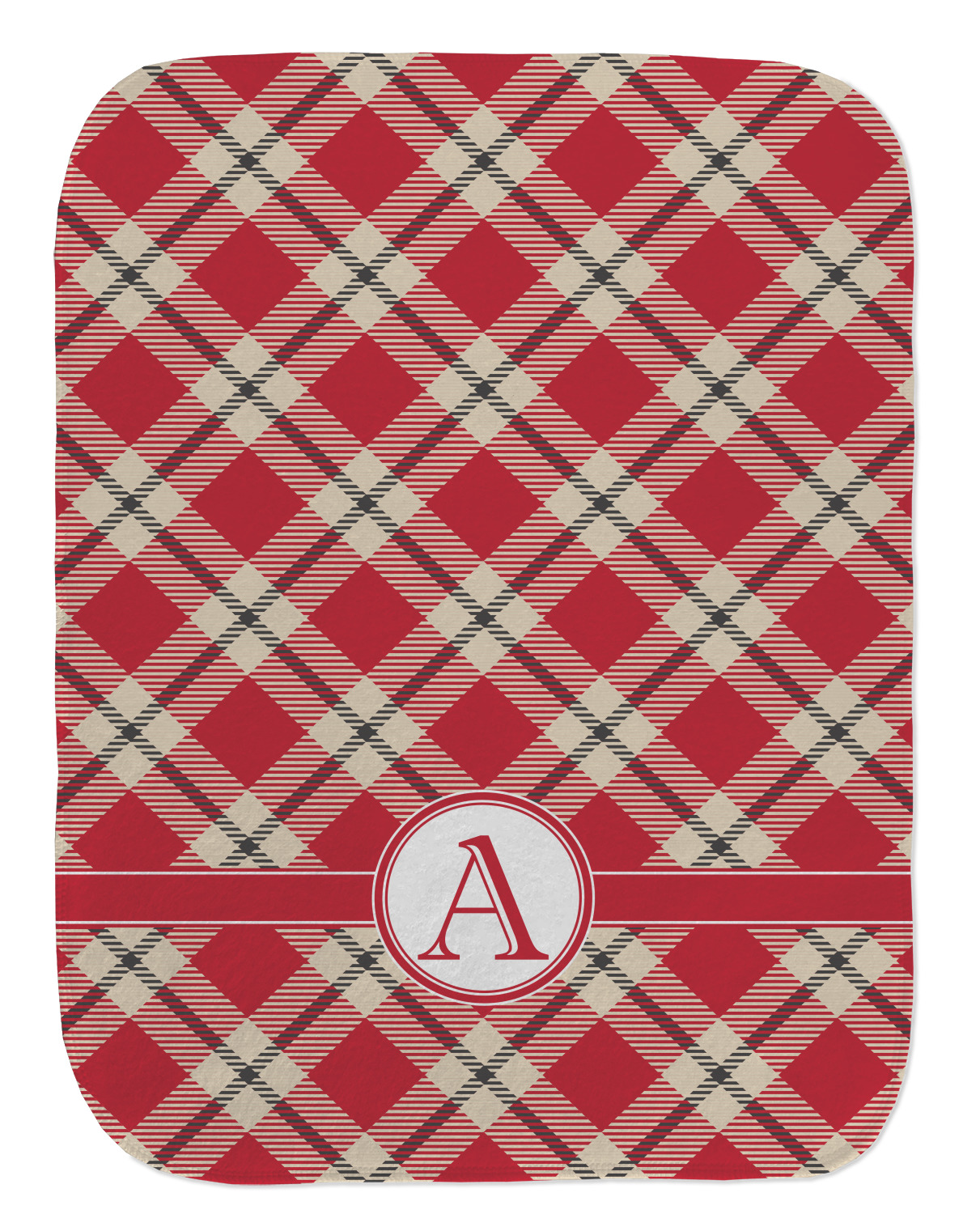 For our design, we chose a simple plaid; we chose red & tan to create a unisex palette and used dark grey for our accent color. We also chose the classic ribbon and round label with an elegant initial for our very simple, yet elegant personalization.
