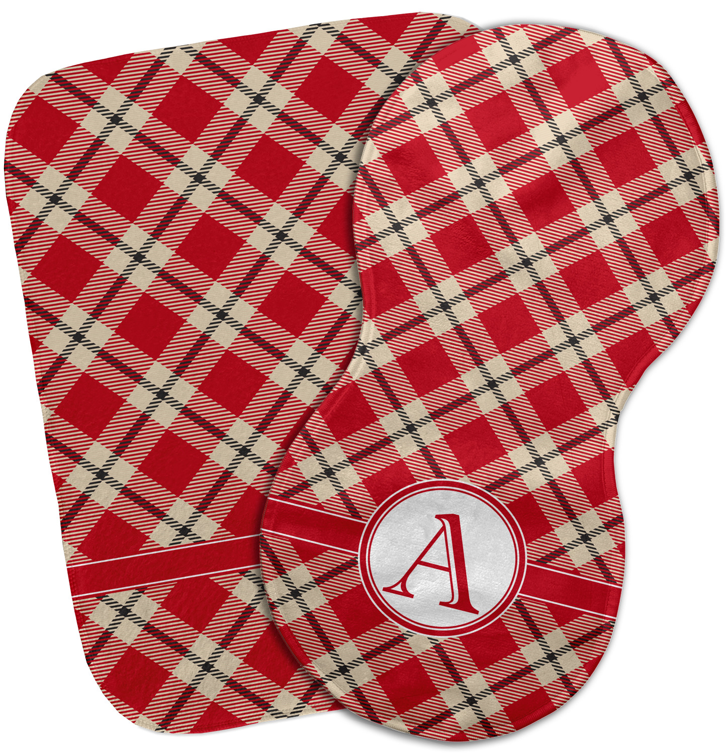 For our design, we chose a simple plaid; we chose red & tan to create a unisex palette and used dark grey for our accent color. We also chose the classic ribbon and round label with an elegant initial for our very simple, yet elegant personalization.