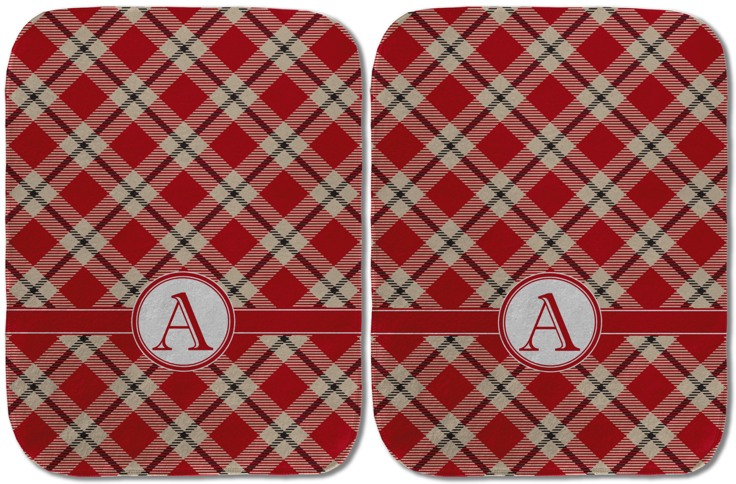 For our design, we chose a simple plaid; we chose red & tan to create a unisex palette and used dark grey for our accent color. We also chose the classic ribbon and round label with an elegant initial for our very simple, yet elegant personalization.