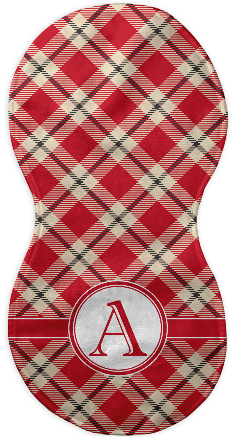 For our design, we chose a simple plaid; we chose red & tan to create a unisex palette and used dark grey for our accent color. We also chose the classic ribbon and round label with an elegant initial for our very simple, yet elegant personalization.