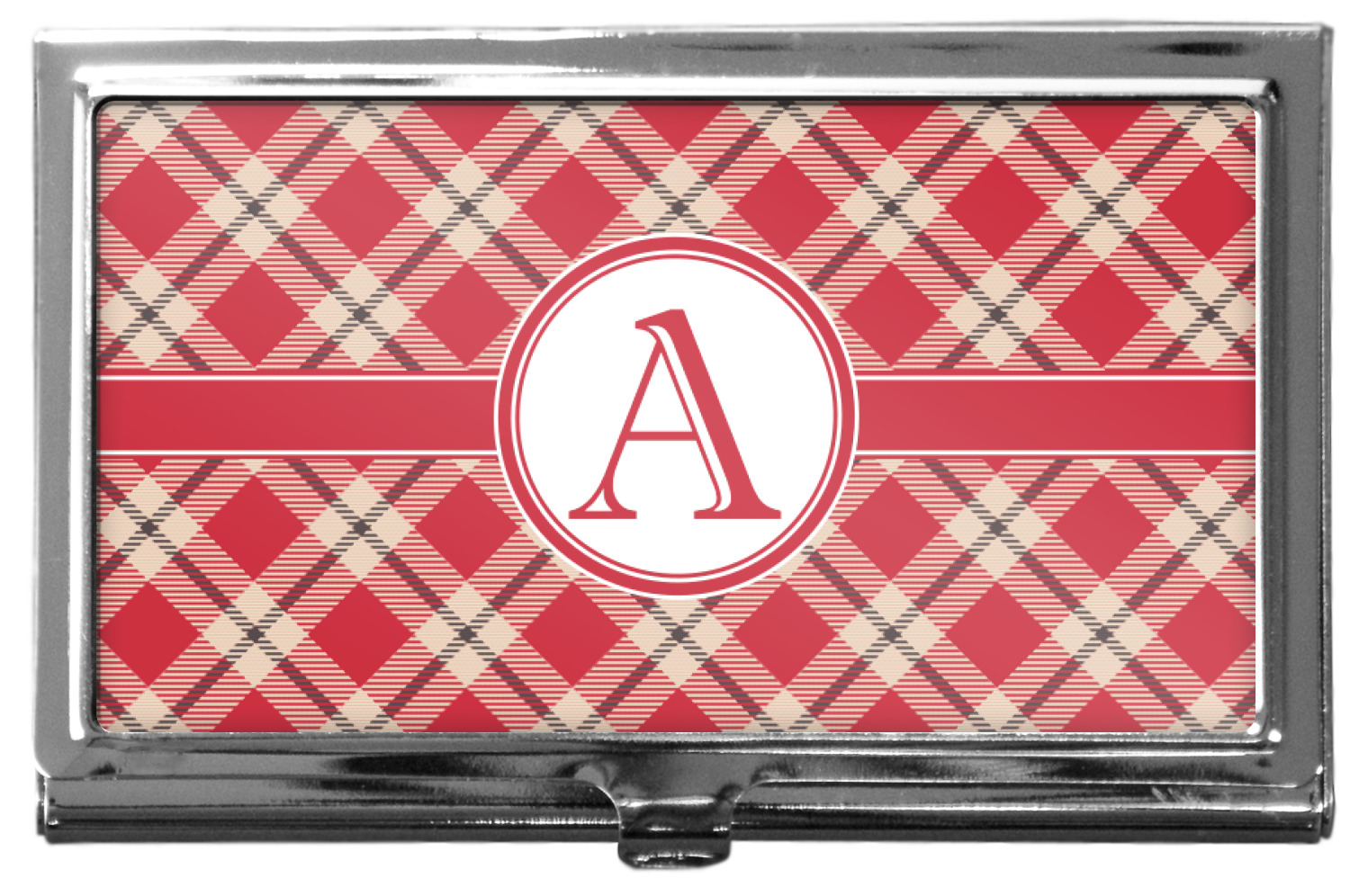 For our design, we chose a simple plaid; we chose red & tan to create a unisex palette and used dark grey for our accent color. We also chose the classic ribbon and round label with an elegant initial for our very simple, yet elegant personalization.