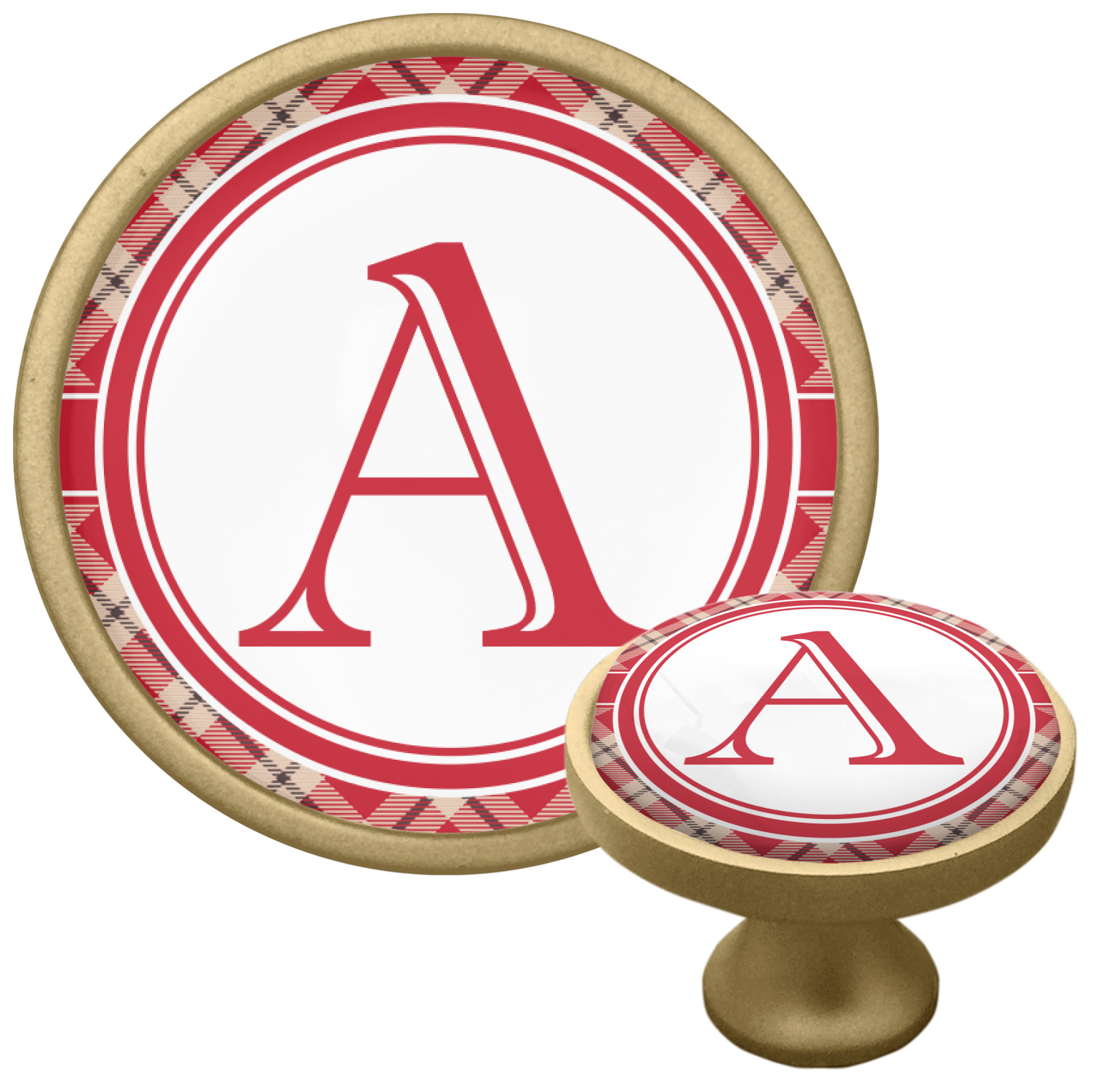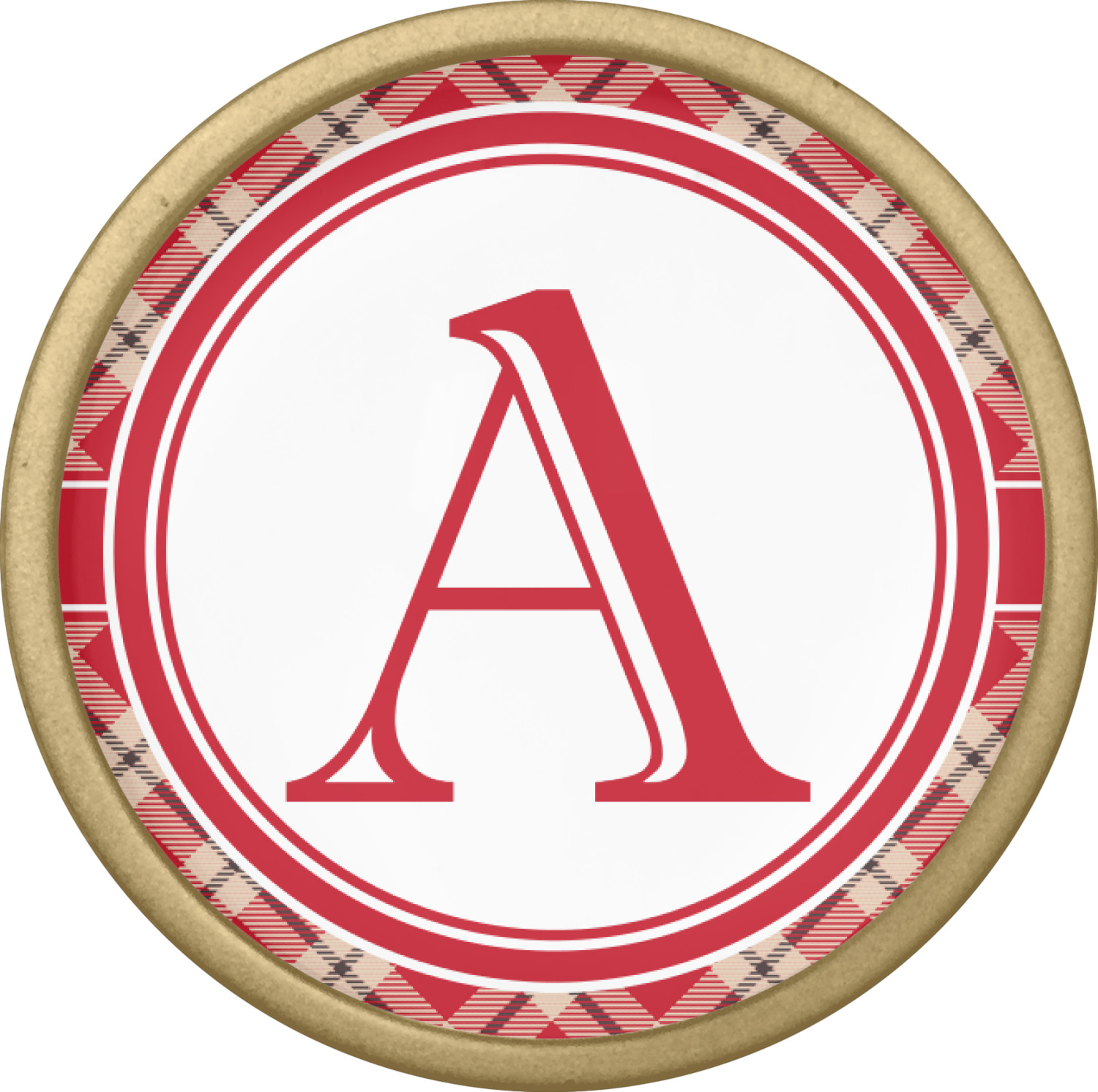 For our design, we chose a simple plaid; we chose red & tan to create a unisex palette and used dark grey for our accent color. We also chose the classic ribbon and round label with an elegant initial for our very simple, yet elegant personalization.