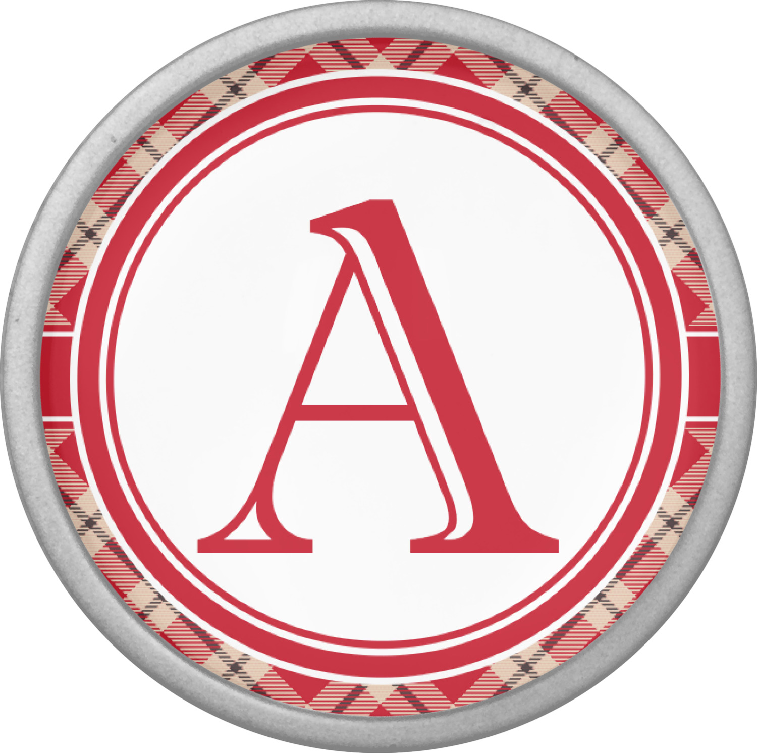 For our design, we chose a simple plaid; we chose red & tan to create a unisex palette and used dark grey for our accent color. We also chose the classic ribbon and round label with an elegant initial for our very simple, yet elegant personalization.