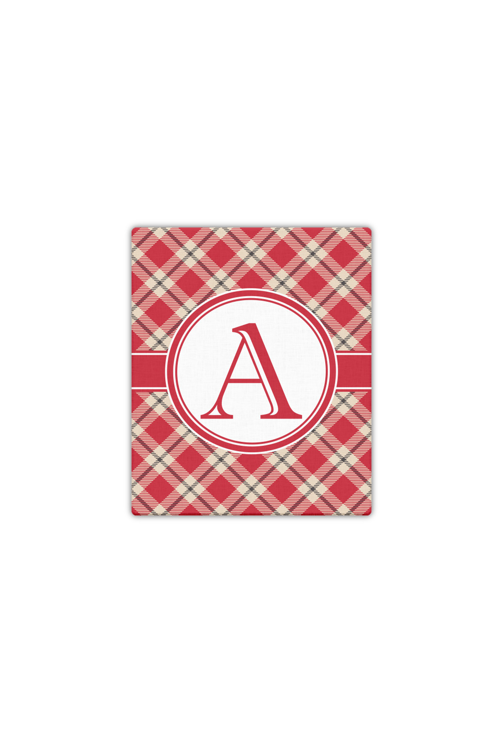 For our design, we chose a simple plaid; we chose red & tan to create a unisex palette and used dark grey for our accent color. We also chose the classic ribbon and round label with an elegant initial for our very simple, yet elegant personalization.