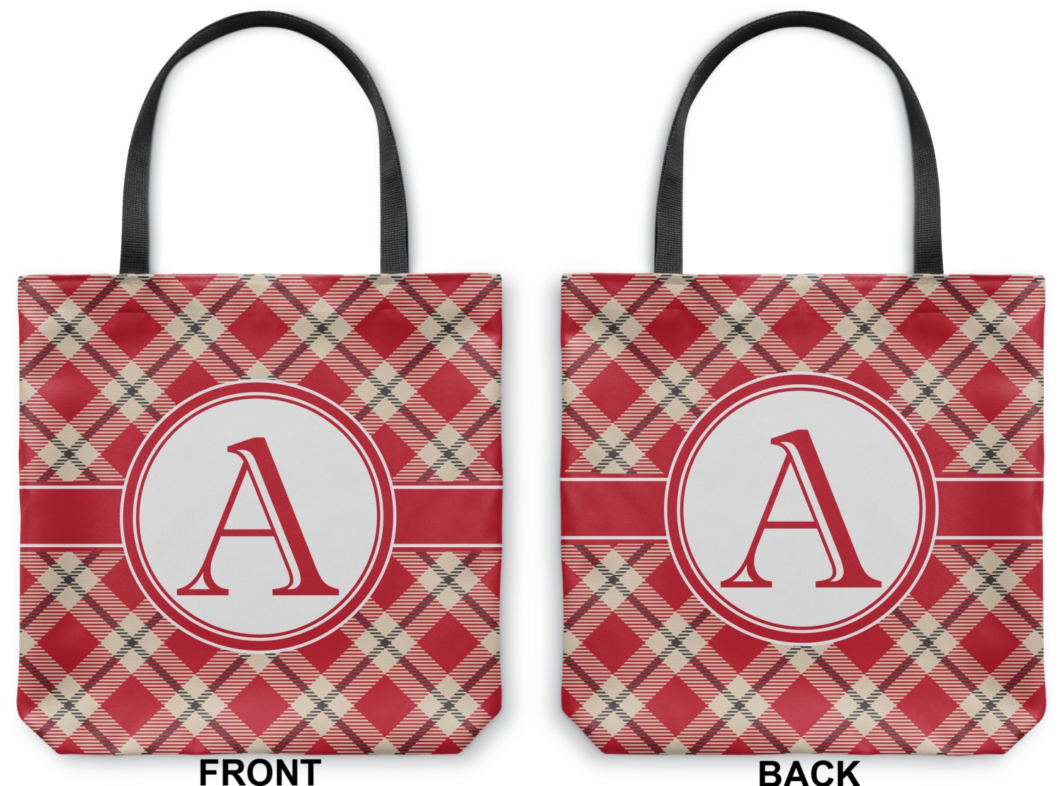 For our design, we chose a simple plaid; we chose red & tan to create a unisex palette and used dark grey for our accent color. We also chose the classic ribbon and round label with an elegant initial for our very simple, yet elegant personalization.