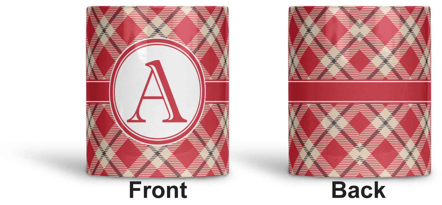 For our design, we chose a simple plaid; we chose red & tan to create a unisex palette and used dark grey for our accent color. We also chose the classic ribbon and round label with an elegant initial for our very simple, yet elegant personalization.