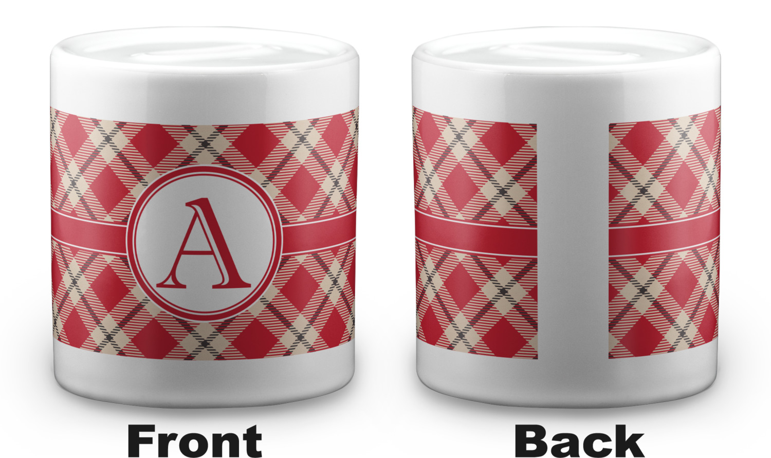 For our design, we chose a simple plaid; we chose red & tan to create a unisex palette and used dark grey for our accent color. We also chose the classic ribbon and round label with an elegant initial for our very simple, yet elegant personalization.