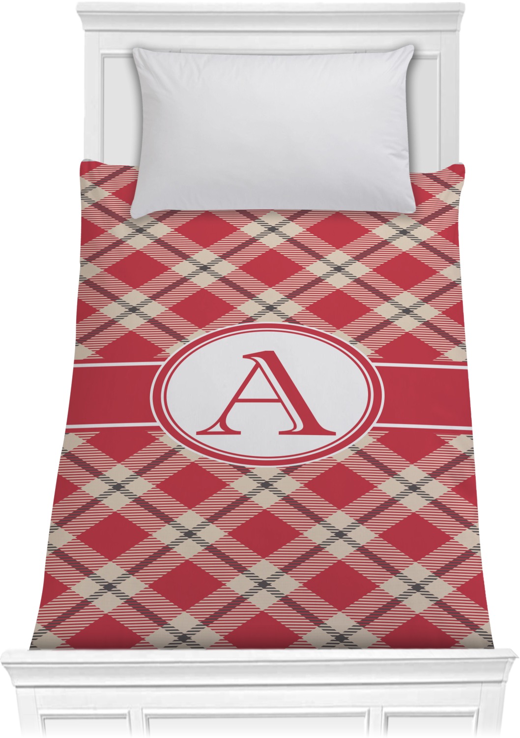 For our design, we chose a simple plaid; we chose red & tan to create a unisex palette and used dark grey for our accent color. We also chose the classic ribbon and round label with an elegant initial for our very simple, yet elegant personalization.