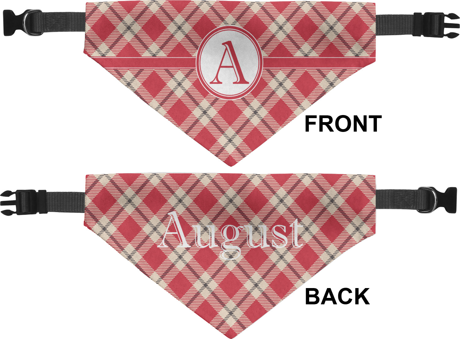 We print the front and back of these dog bandanas with your customized design. The bandana itself is made from a durable polyester, sewn together with a gap large enough to accommodate any collar. Regardless, the bandana includes a plain black, canvas collar with plastic snaps, that can easily be removed if desired. These dog bandana collars are available in four sizes: small, medium, large, and extra large. Please see our sizing chart for more information regarding the dimensions of each size.