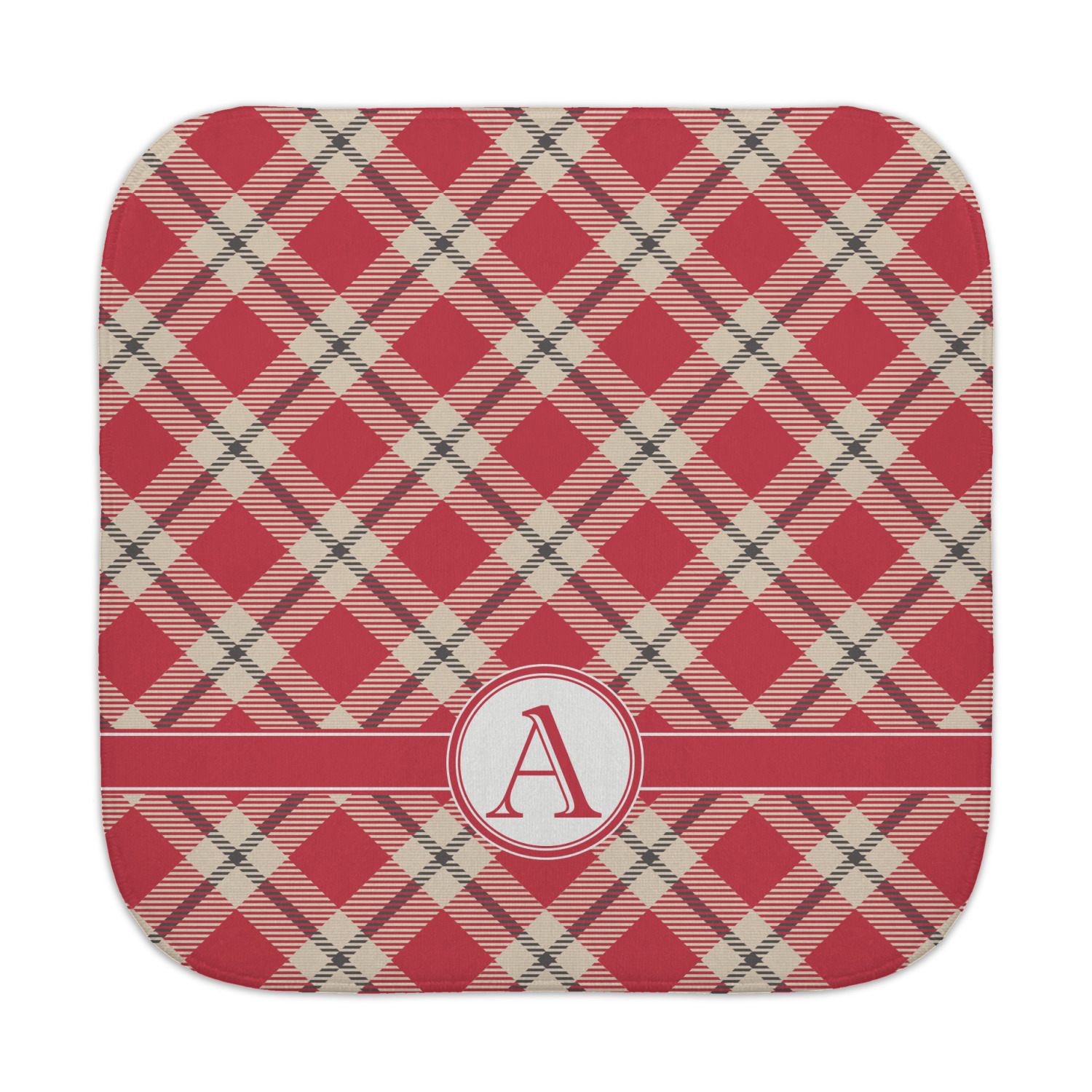 For our design, we chose a simple plaid; we chose red & tan to create a unisex palette and used dark grey for our accent color. We also chose the classic ribbon and round label with an elegant initial for our very simple, yet elegant personalization.