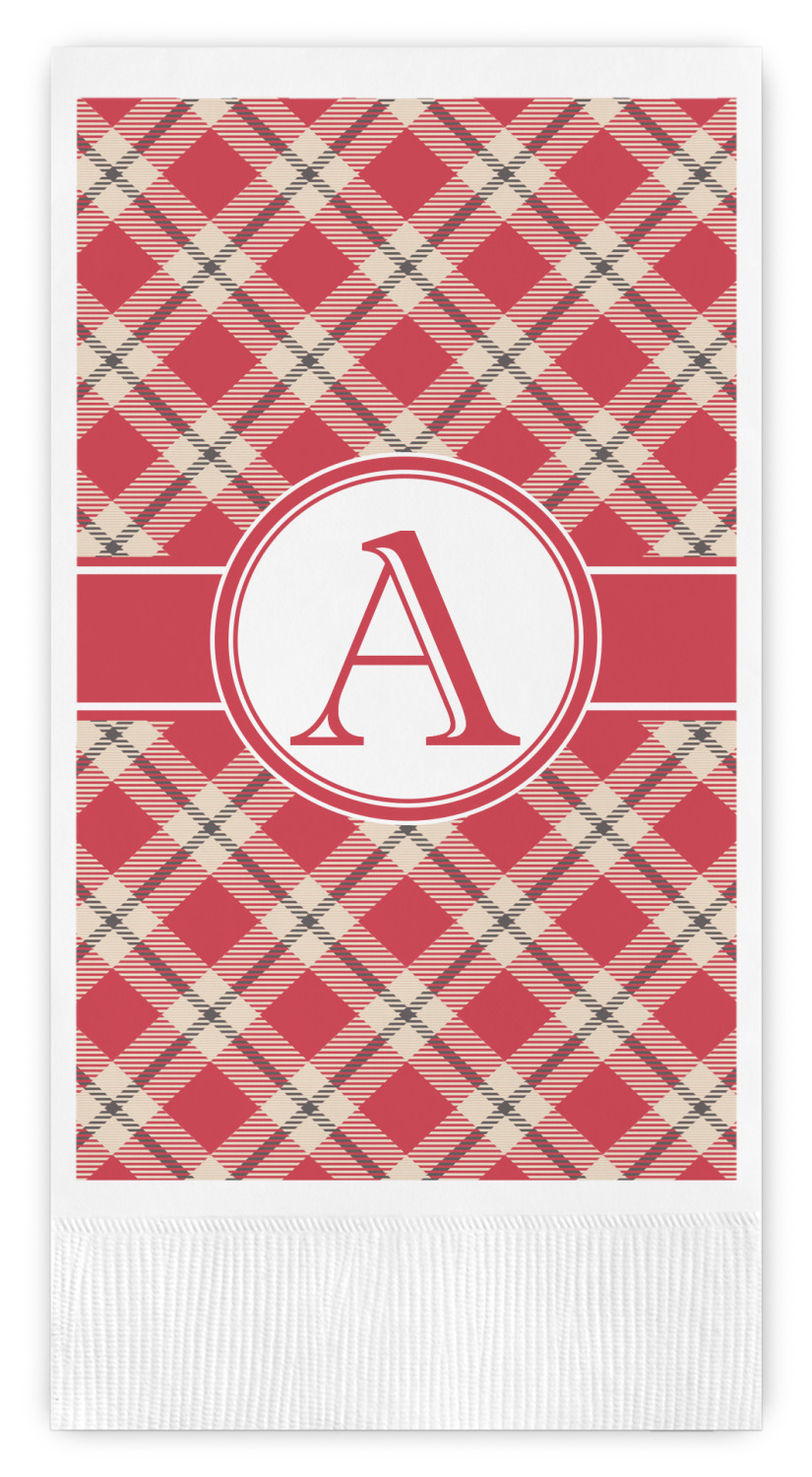For our design, we chose a simple plaid; we chose red & tan to create a unisex palette and used dark grey for our accent color. We also chose the classic ribbon and round label with an elegant initial for our very simple, yet elegant personalization.