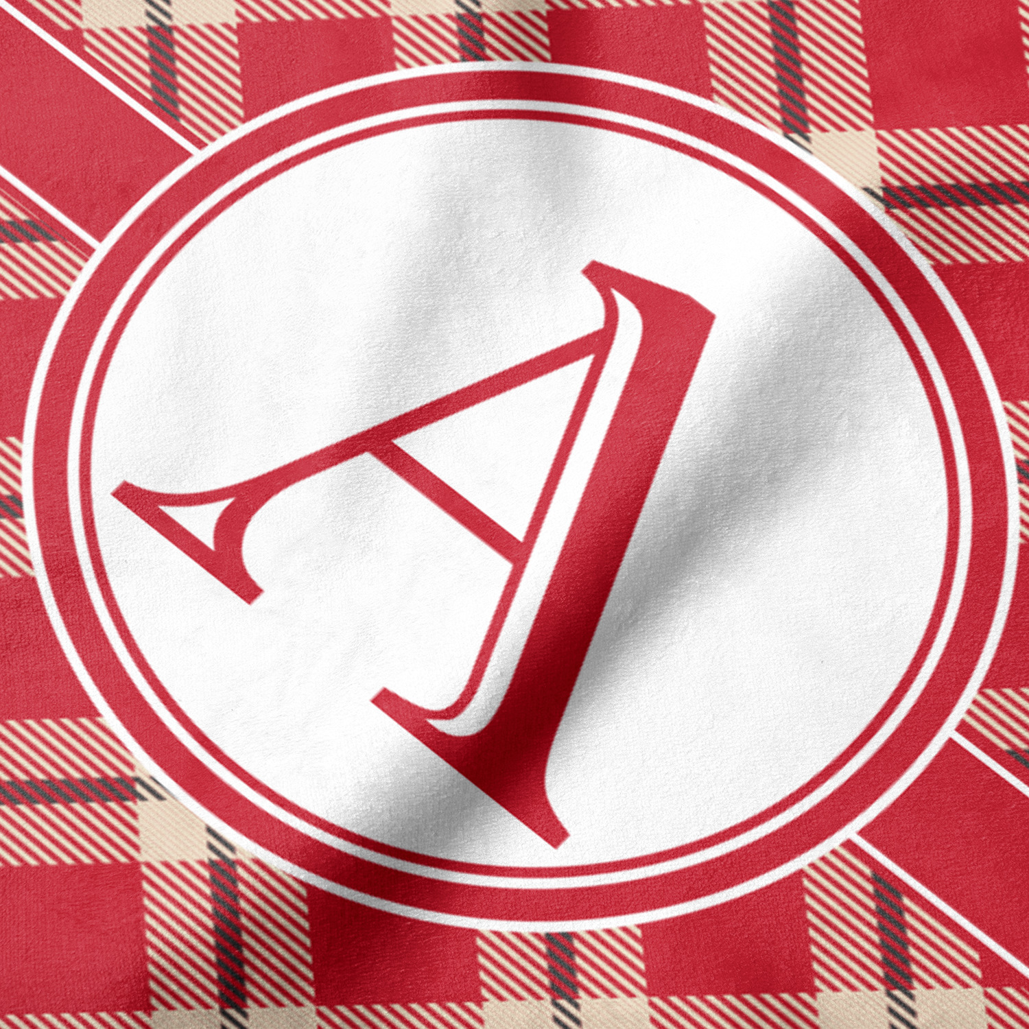 For our design, we chose a simple plaid; we chose red & tan to create a unisex palette and used dark grey for our accent color. We also chose the classic ribbon and round label with an elegant initial for our very simple, yet elegant personalization.