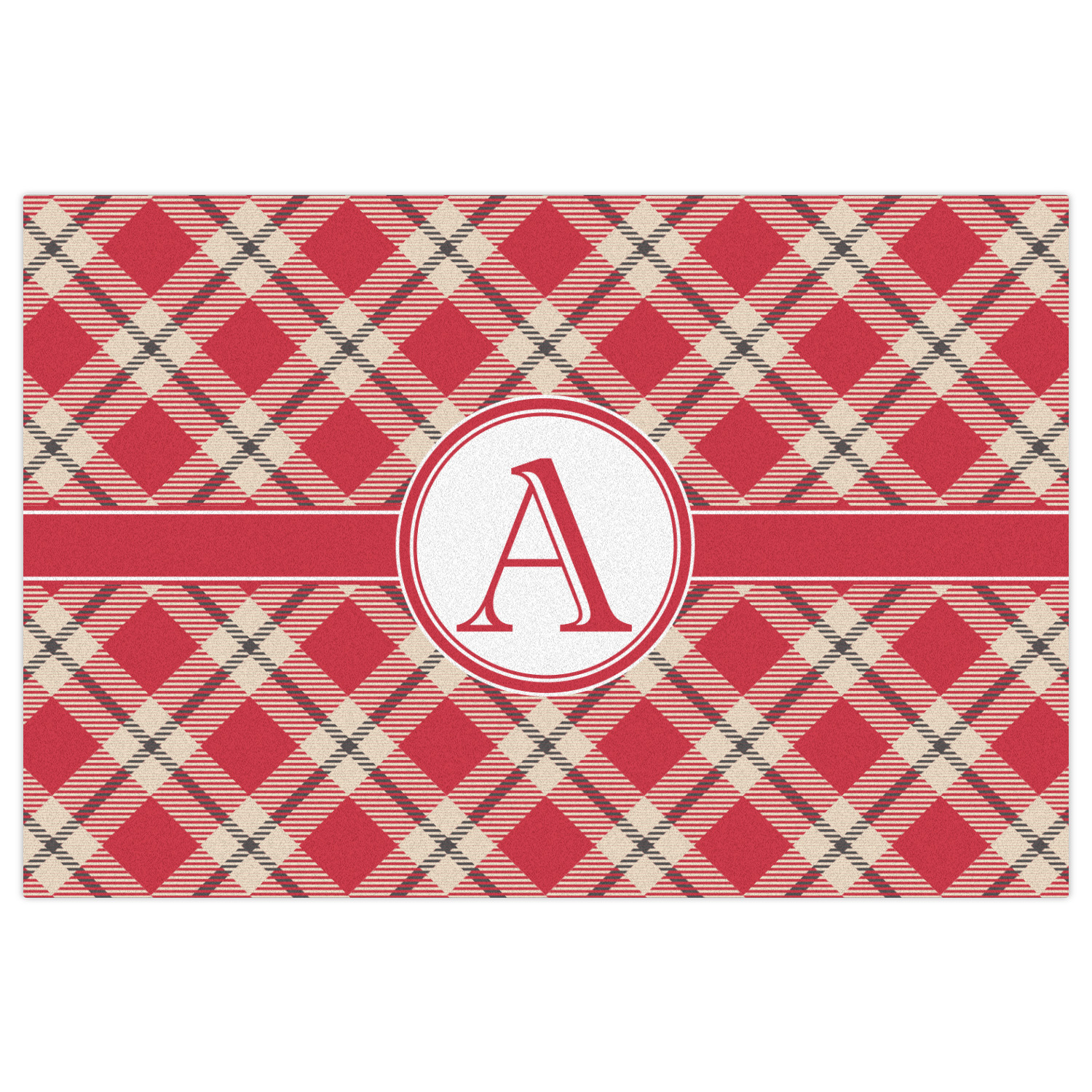 For our design, we chose a simple plaid; we chose red & tan to create a unisex palette and used dark grey for our accent color. We also chose the classic ribbon and round label with an elegant initial for our very simple, yet elegant personalization.