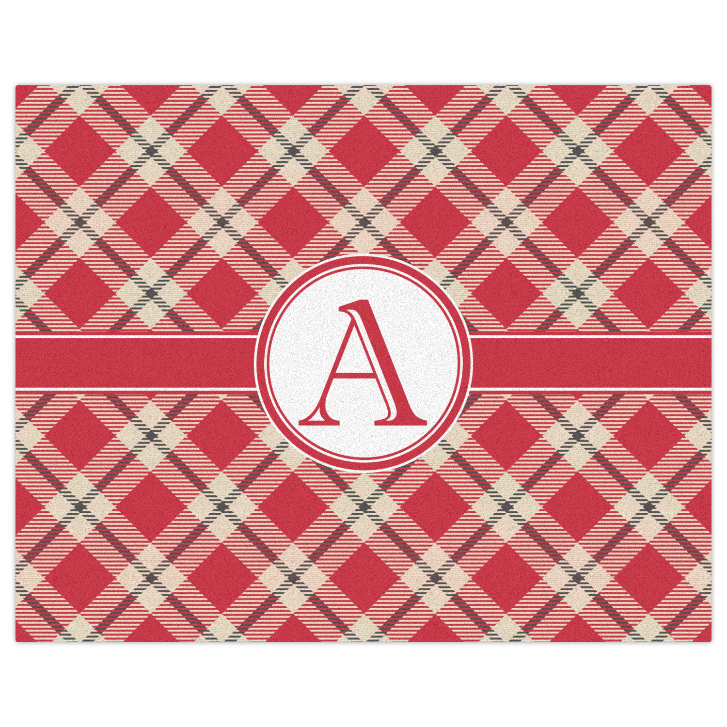 For our design, we chose a simple plaid; we chose red & tan to create a unisex palette and used dark grey for our accent color. We also chose the classic ribbon and round label with an elegant initial for our very simple, yet elegant personalization.