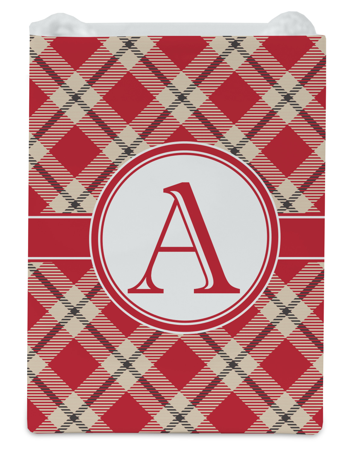 For our design, we chose a simple plaid; we chose red & tan to create a unisex palette and used dark grey for our accent color. We also chose the classic ribbon and round label with an elegant initial for our very simple, yet elegant personalization.