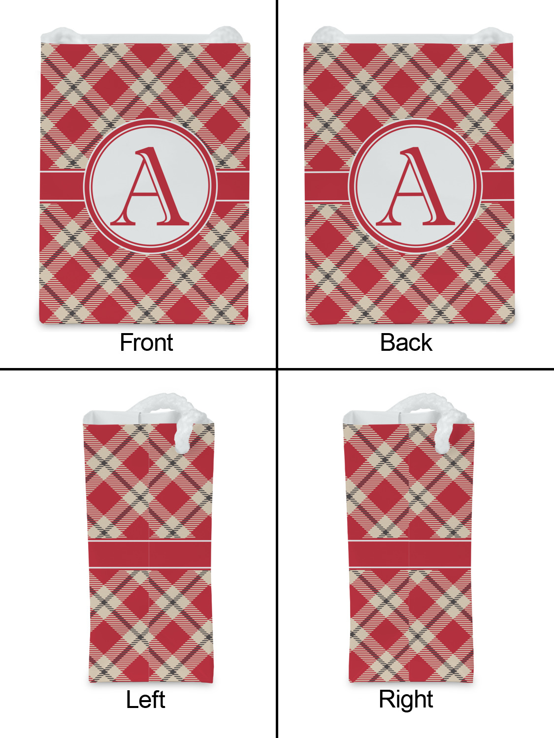 For our design, we chose a simple plaid; we chose red & tan to create a unisex palette and used dark grey for our accent color. We also chose the classic ribbon and round label with an elegant initial for our very simple, yet elegant personalization.