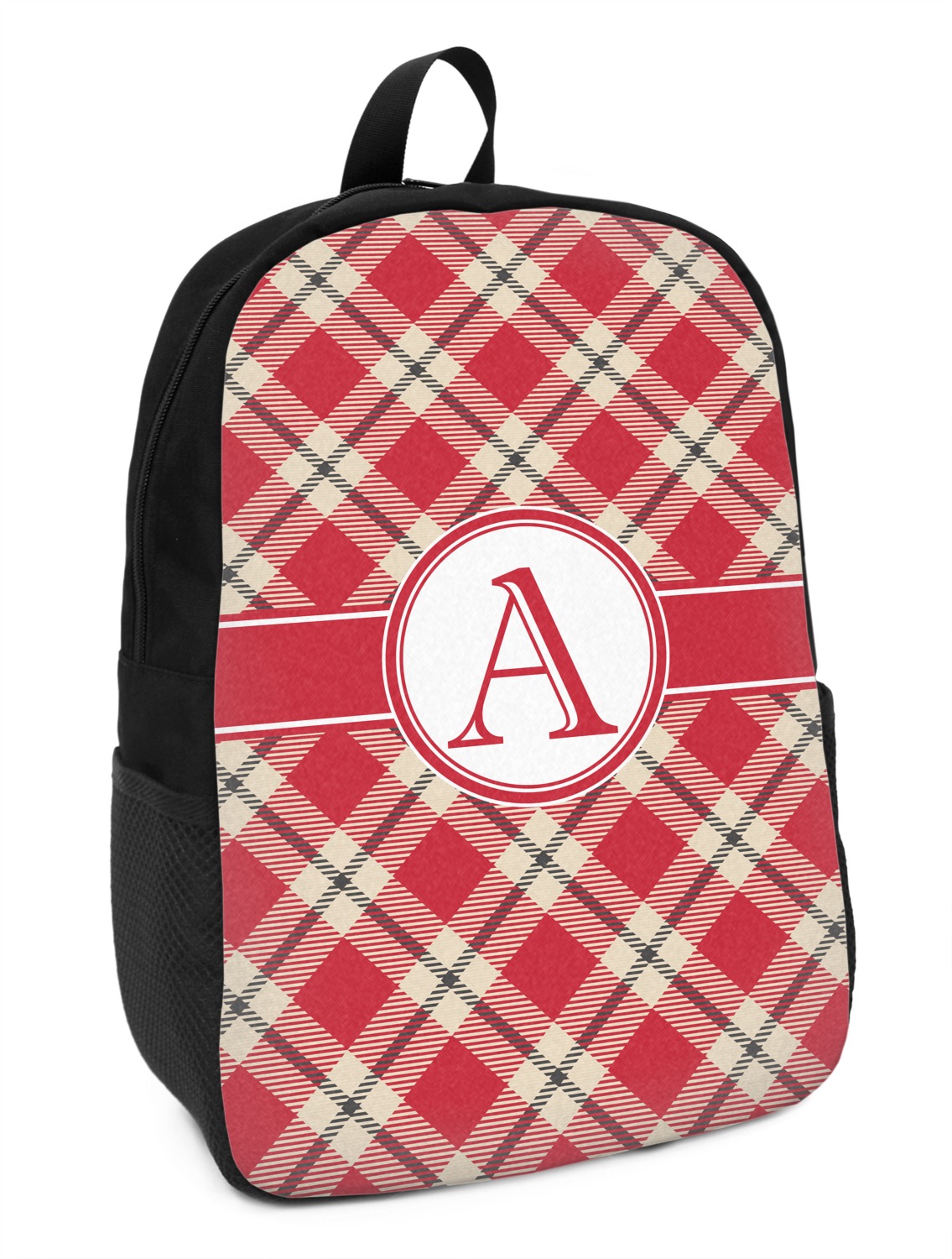 For our design, we chose a simple plaid; we chose red & tan to create a unisex palette and used dark grey for our accent color. We also chose the classic ribbon and round label with an elegant initial for our very simple, yet elegant personalization.