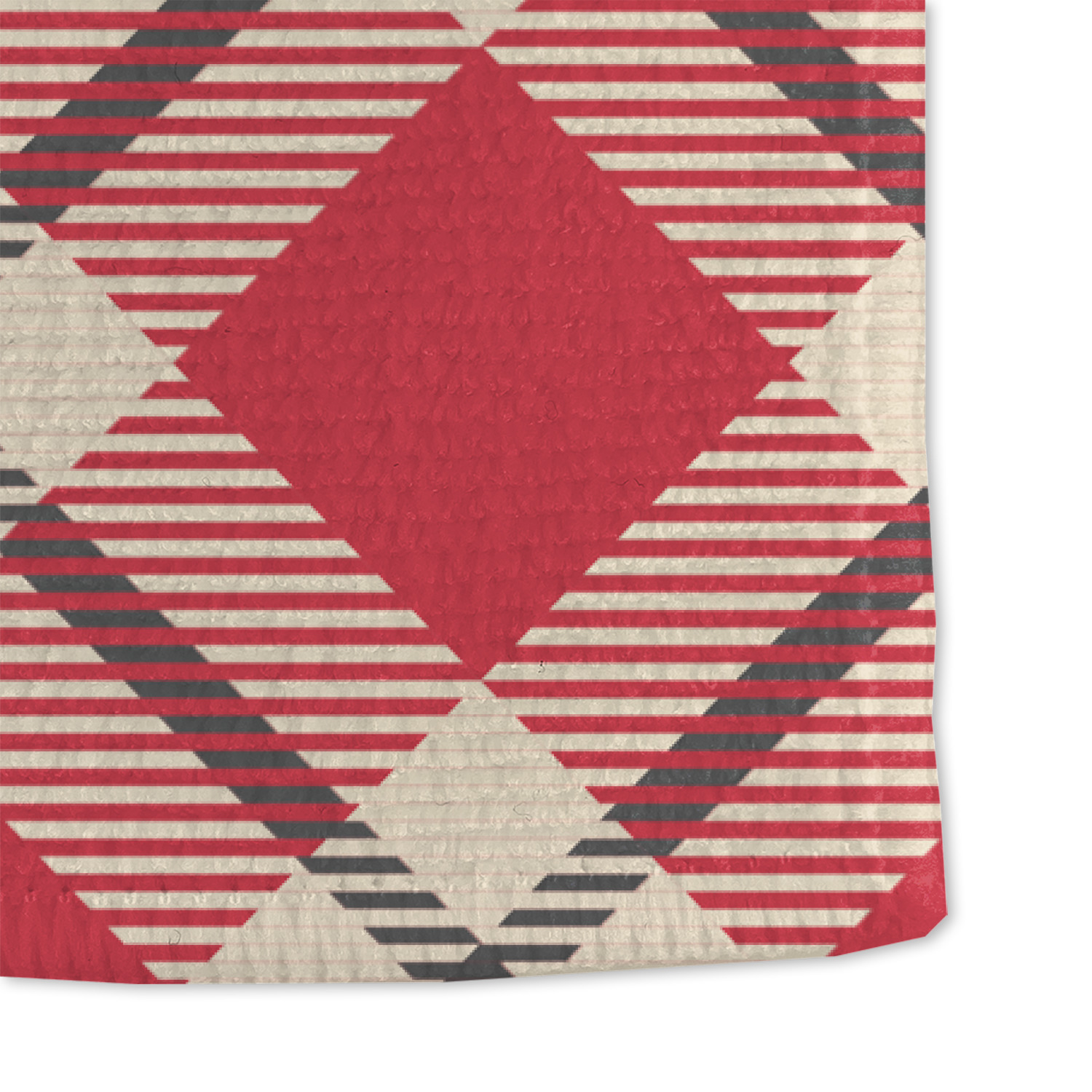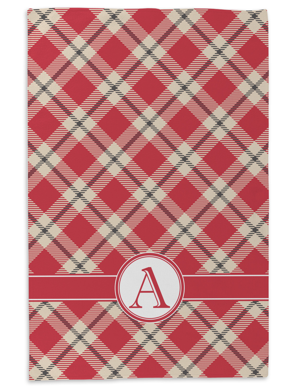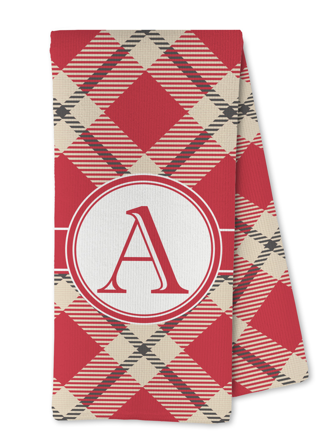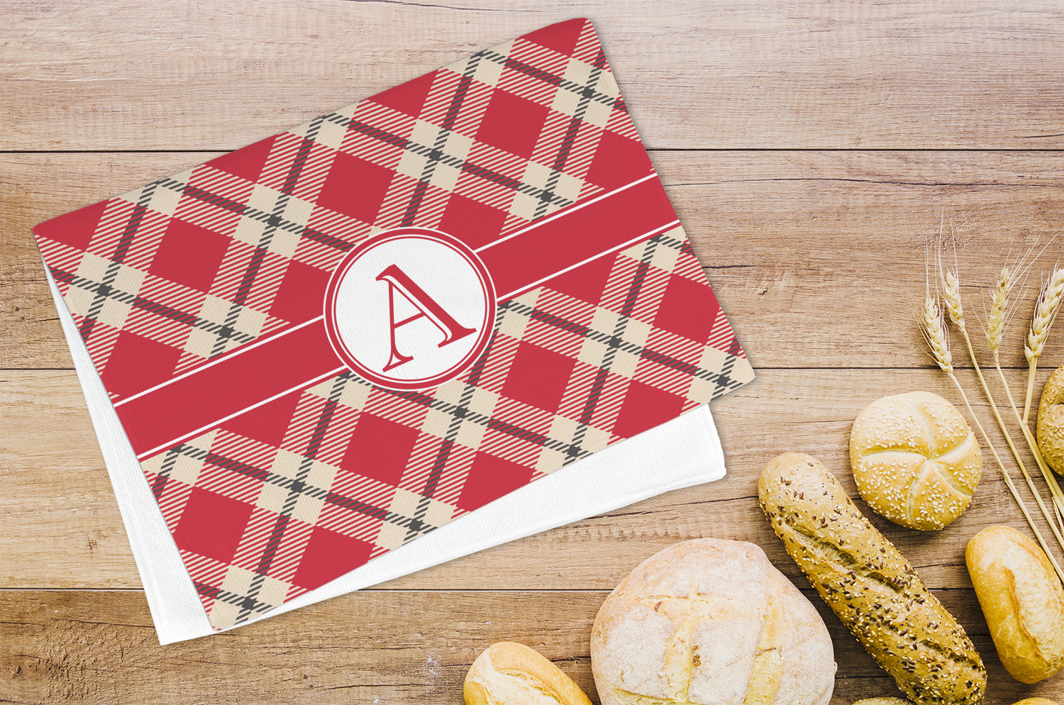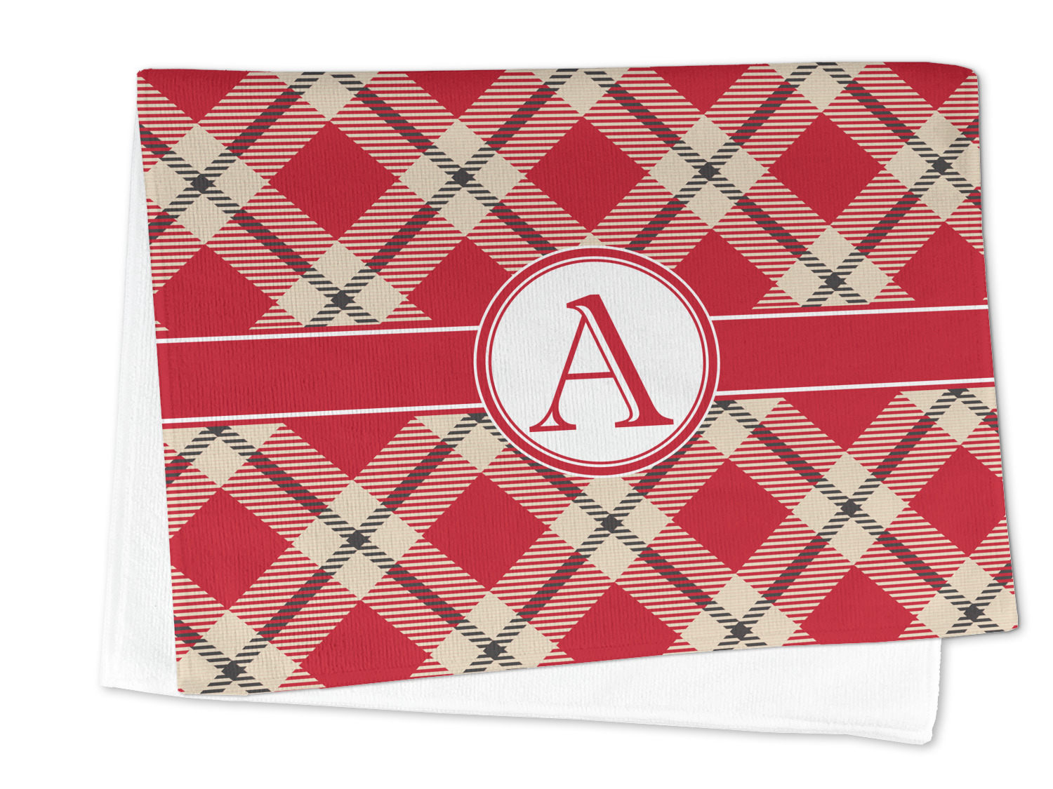 For our design, we chose a simple plaid; we chose red & tan to create a unisex palette and used dark grey for our accent color. We also chose the classic ribbon and round label with an elegant initial for our very simple, yet elegant personalization.