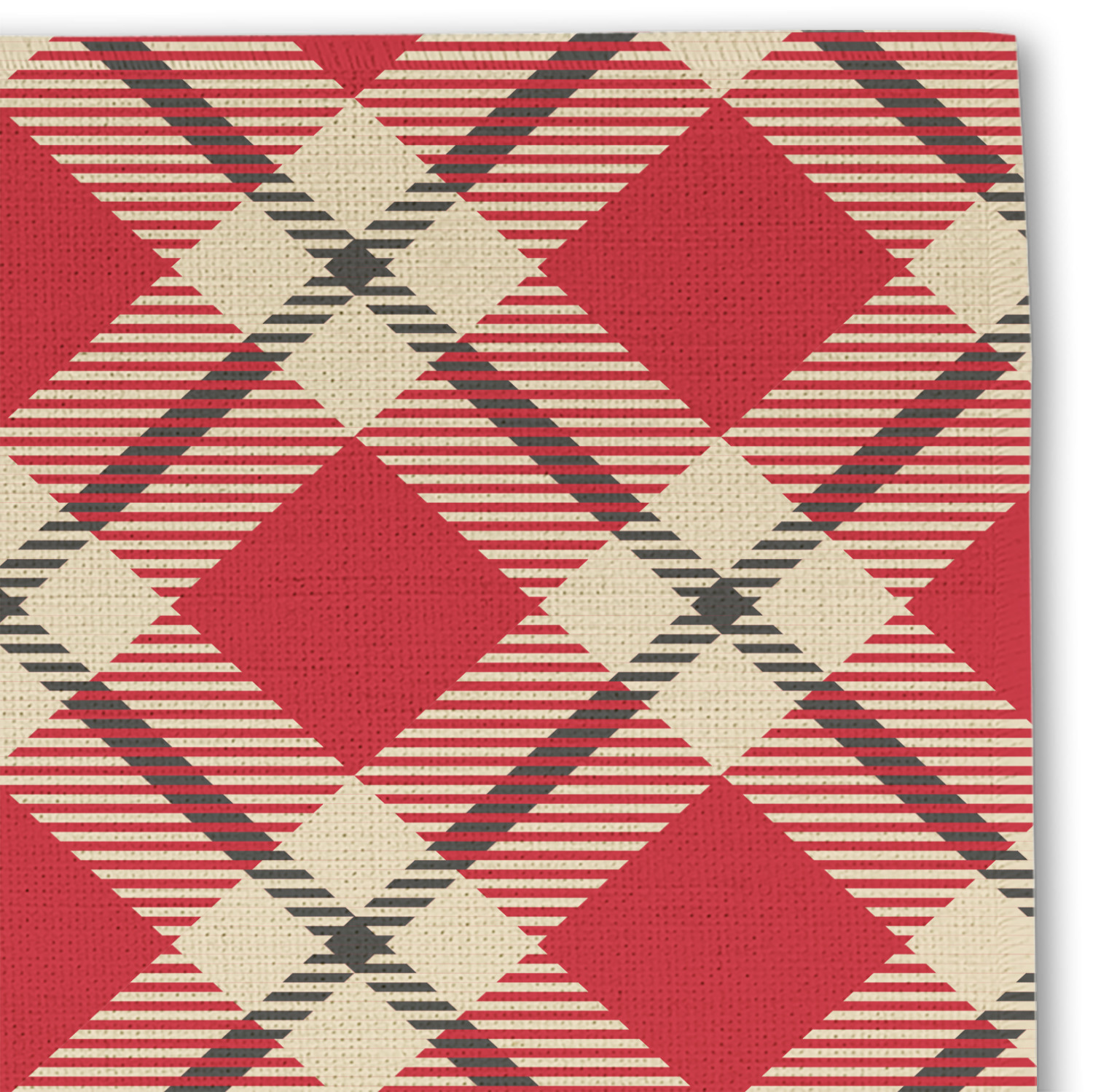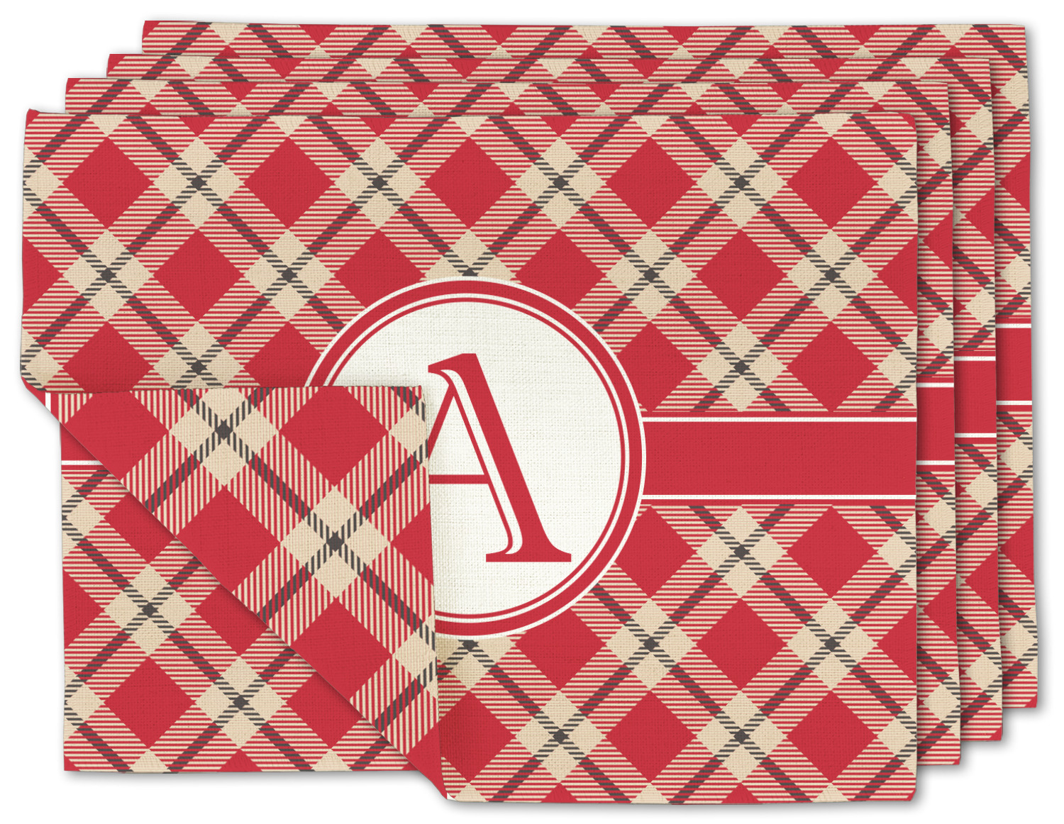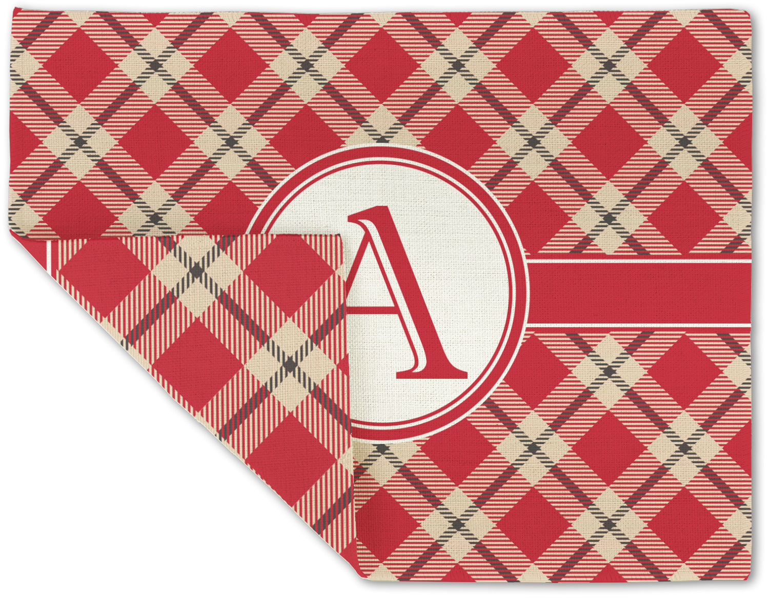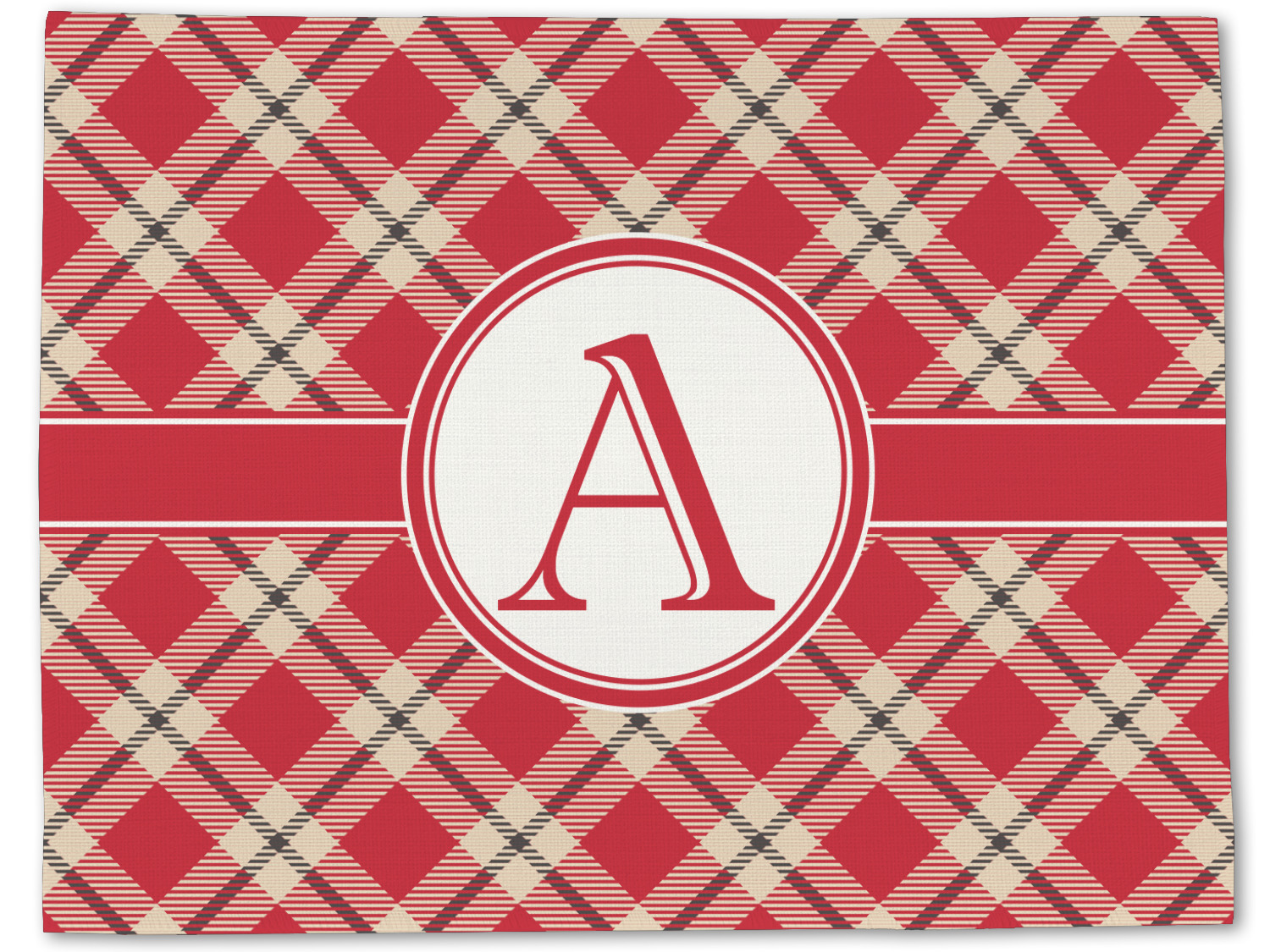 For our design, we chose a simple plaid; we chose red & tan to create a unisex palette and used dark grey for our accent color. We also chose the classic ribbon and round label with an elegant initial for our very simple, yet elegant personalization.