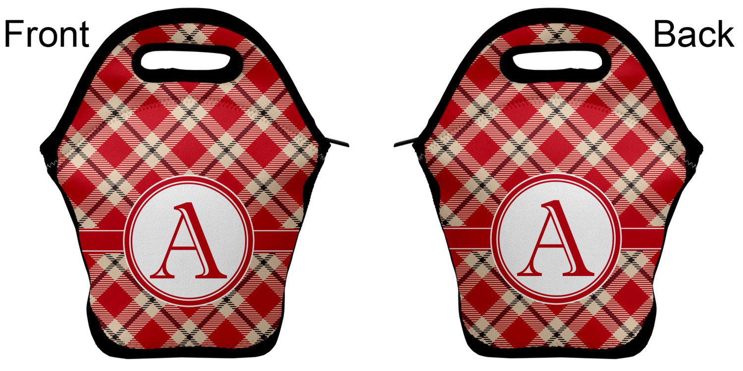 Our personalized lunch bags are made from a strong neoprene, and secure with a zipper closure that lines the top of the bag.The edges of the neoprene are sewn together with a heavy duty stitch, adding to the durability of the bag. The is accompanied by a reinforced handle at its top, for the easy transport of your lunch. We display your personalization across both the front and back of this neoprene lunch bag, while the remaining sides are a sleek black in color. Each bag measures at 13.5 inches tall, and 11.5 inches wide.
