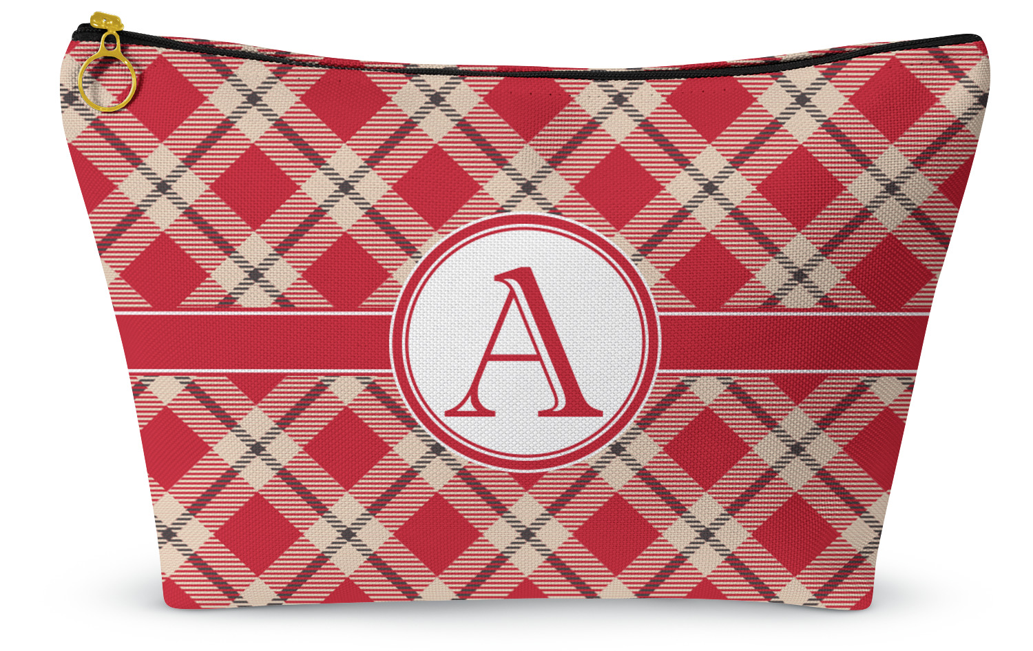 For our design, we chose a simple plaid; we chose red & tan to create a unisex palette and used dark grey for our accent color. We also chose the classic ribbon and round label with an elegant initial for our very simple, yet elegant personalization.