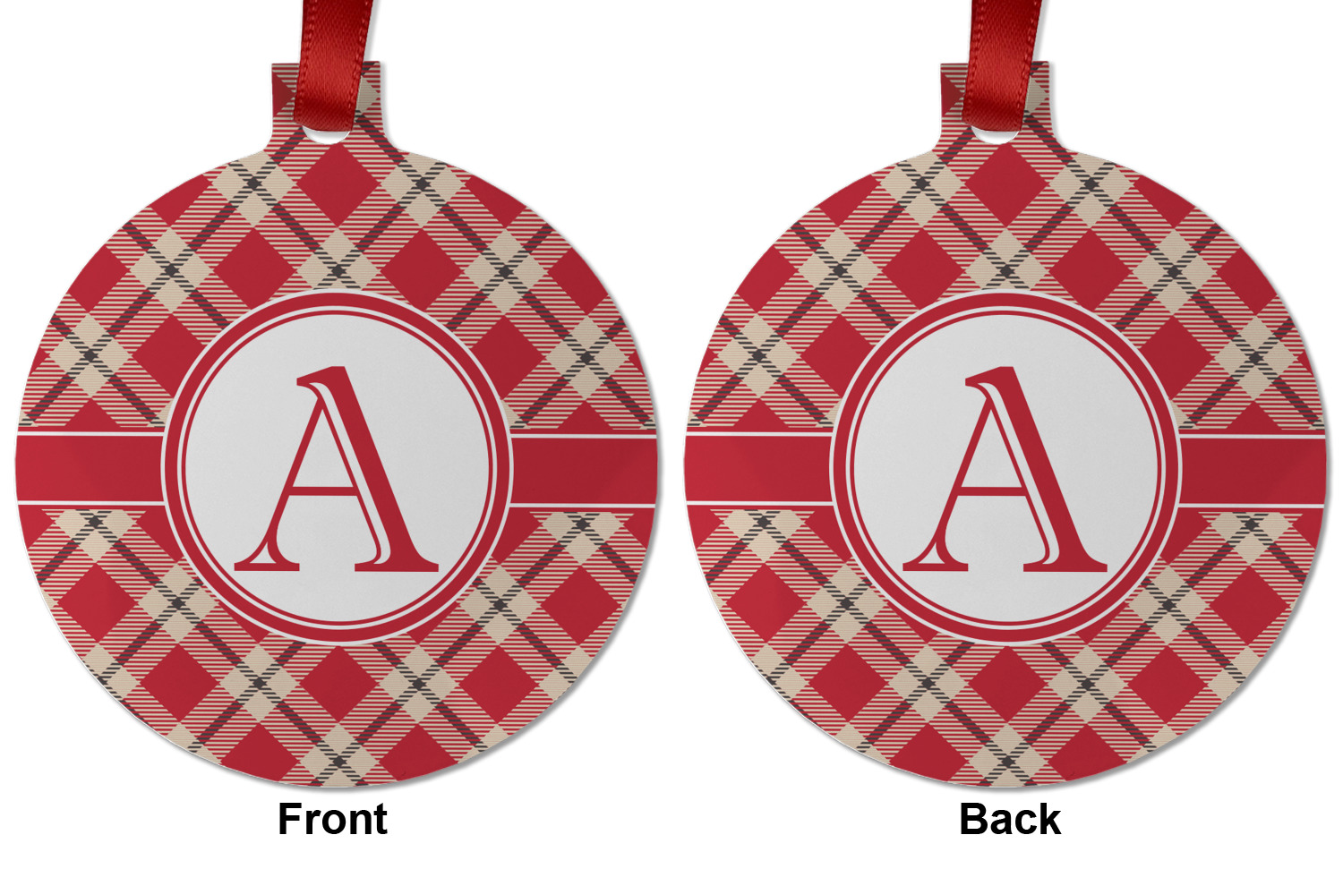 For our design, we chose a simple plaid; we chose red & tan to create a unisex palette and used dark grey for our accent color. We also chose the classic ribbon and round label with an elegant initial for our very simple, yet elegant personalization.