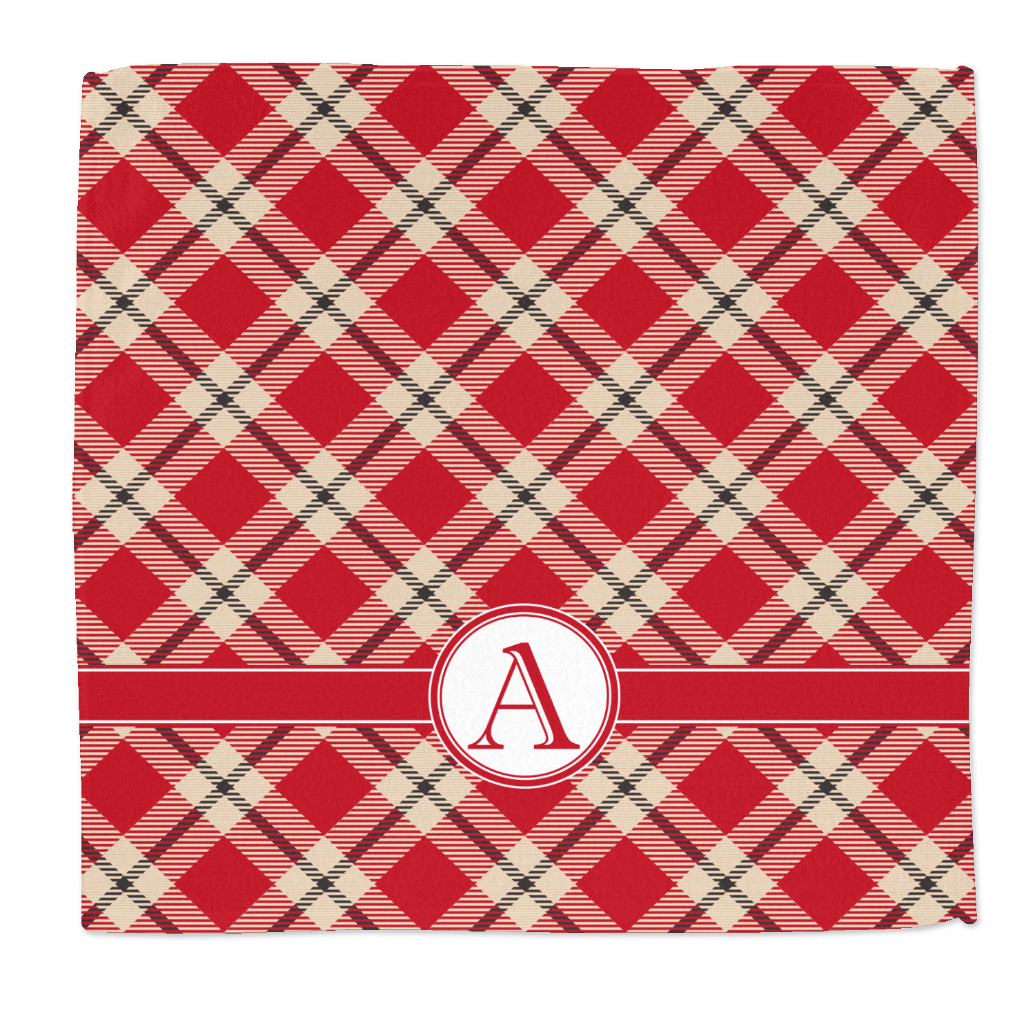 For our design, we chose a simple plaid; we chose red & tan to create a unisex palette and used dark grey for our accent color. We also chose the classic ribbon and round label with an elegant initial for our very simple, yet elegant personalization.