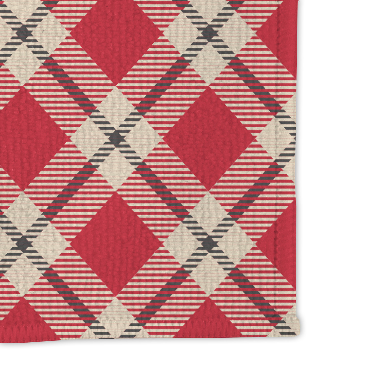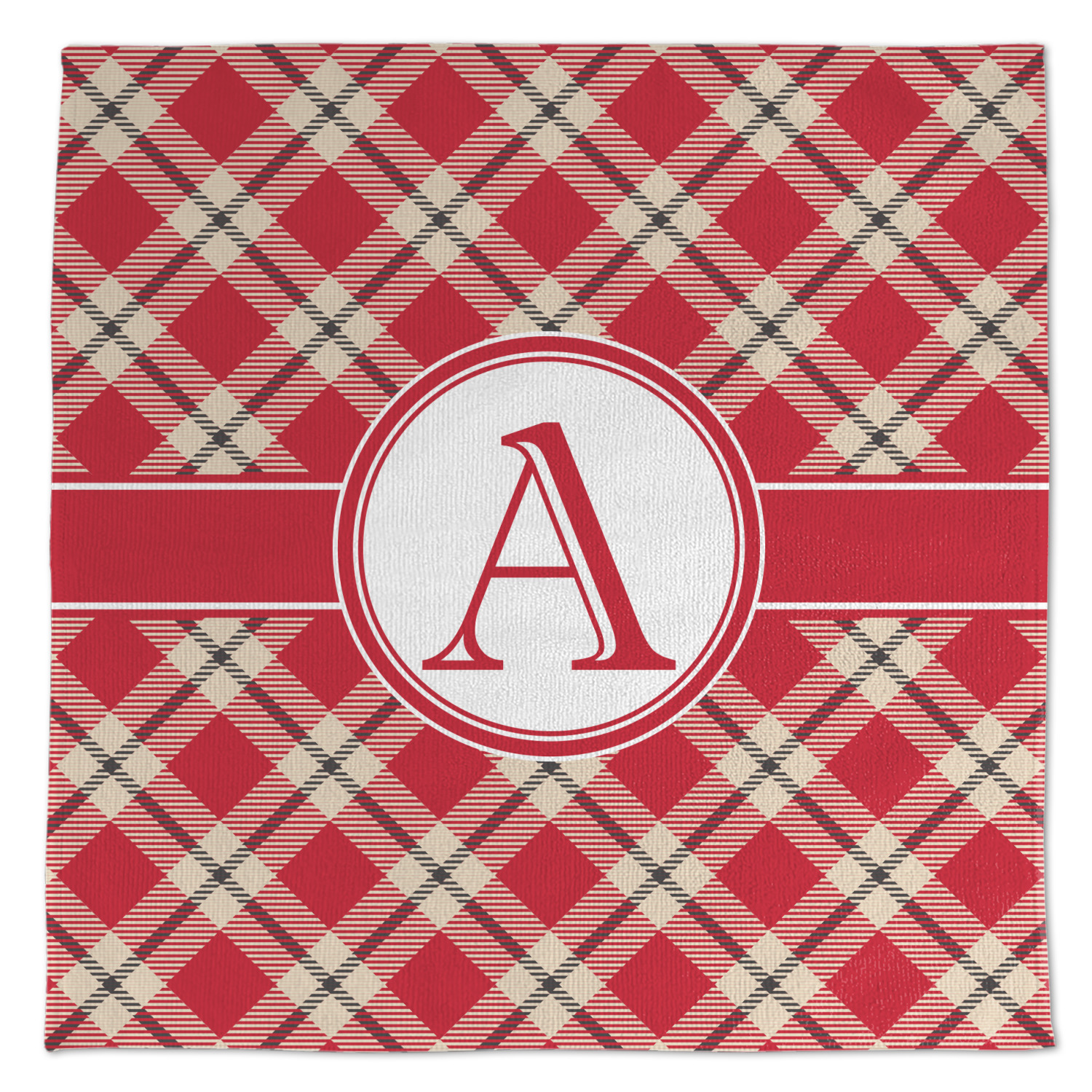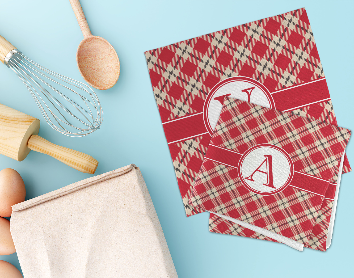 For our design, we chose a simple plaid; we chose red & tan to create a unisex palette and used dark grey for our accent color. We also chose the classic ribbon and round label with an elegant initial for our very simple, yet elegant personalization.
