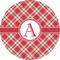 For our design, we chose a simple plaid; we chose red & tan to create a unisex palette and used dark grey for our accent color. We also chose the classic ribbon and round label with an elegant initial for our very simple, yet elegant personalization.