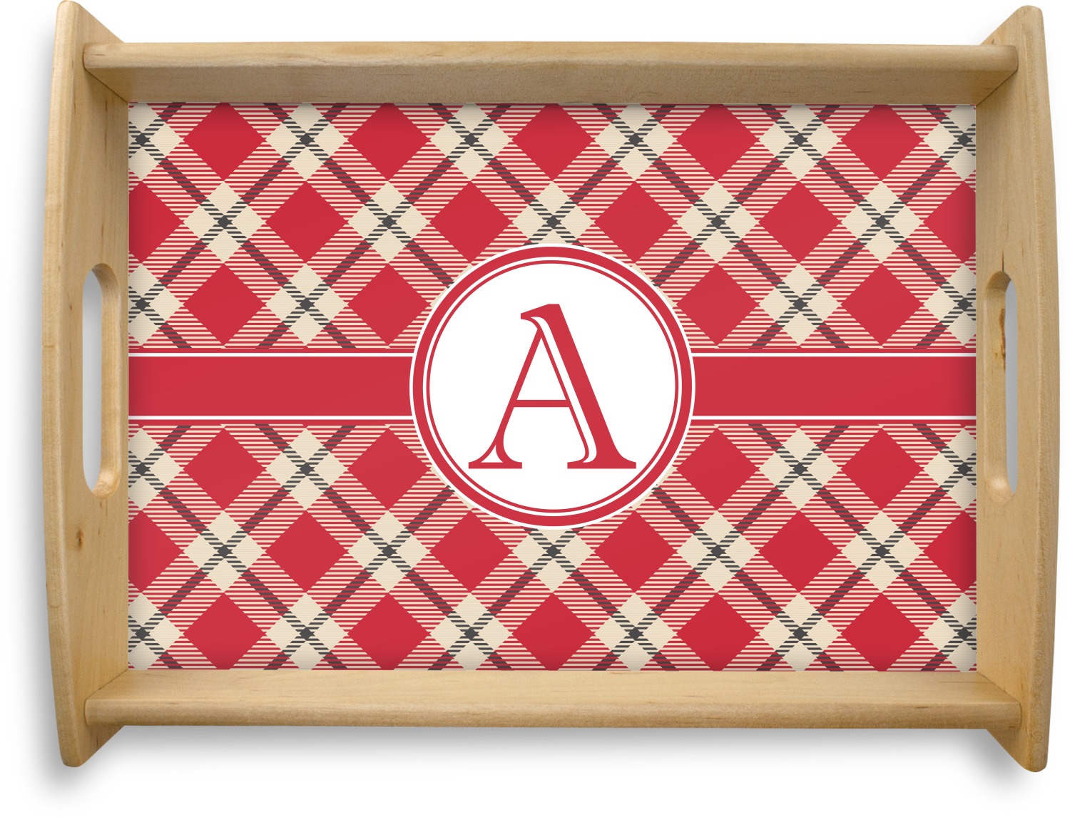 For our design, we chose a simple plaid; we chose red & tan to create a unisex palette and used dark grey for our accent color. We also chose the classic ribbon and round label with an elegant initial for our very simple, yet elegant personalization.