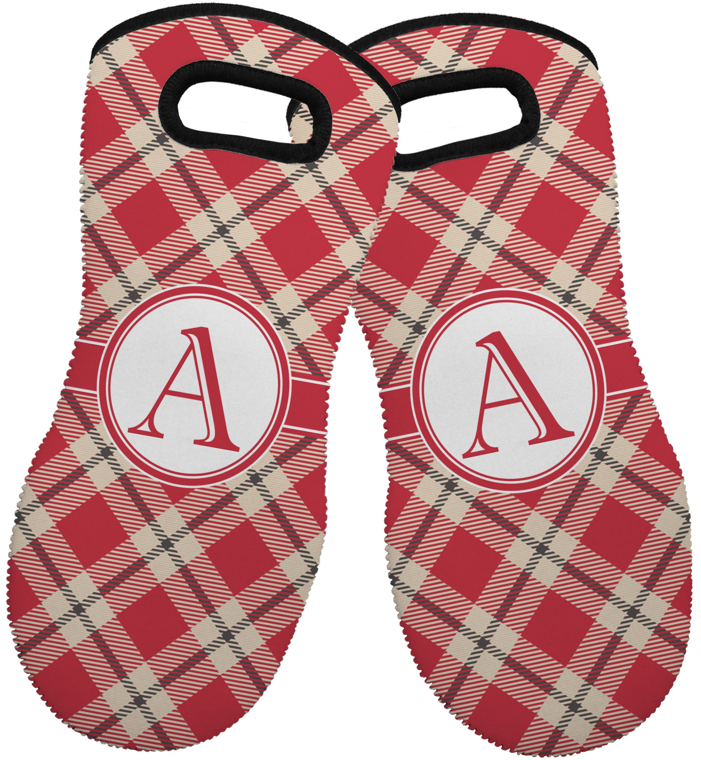For our design, we chose a simple plaid; we chose red & tan to create a unisex palette and used dark grey for our accent color. We also chose the classic ribbon and round label with an elegant initial for our very simple, yet elegant personalization.