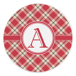 For our design, we chose a simple plaid; we chose red & tan to create a unisex palette and used dark grey for our accent color. We also chose the classic ribbon and round label with an elegant initial for our very simple, yet elegant personalization.