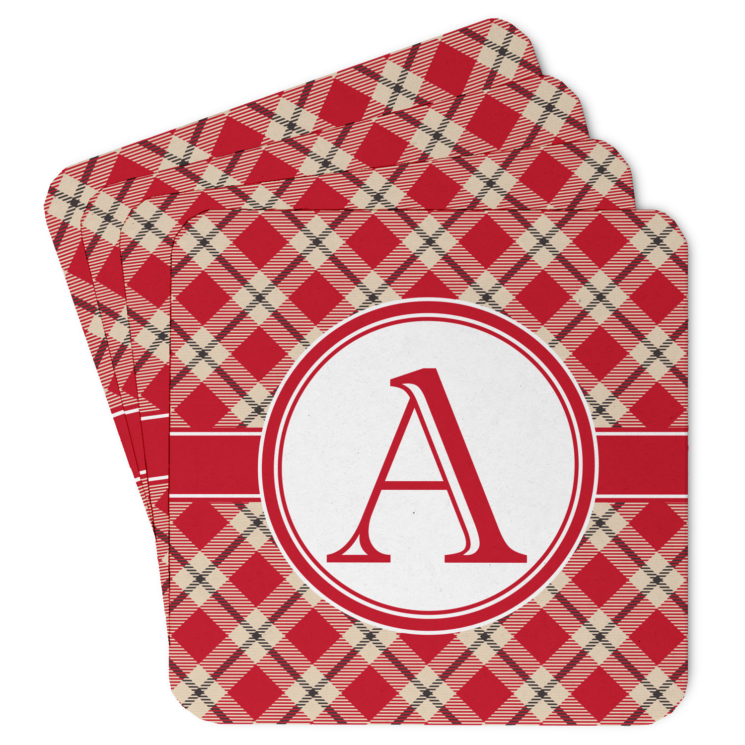 For our design, we chose a simple plaid; we chose red & tan to create a unisex palette and used dark grey for our accent color. We also chose the classic ribbon and round label with an elegant initial for our very simple, yet elegant personalization.