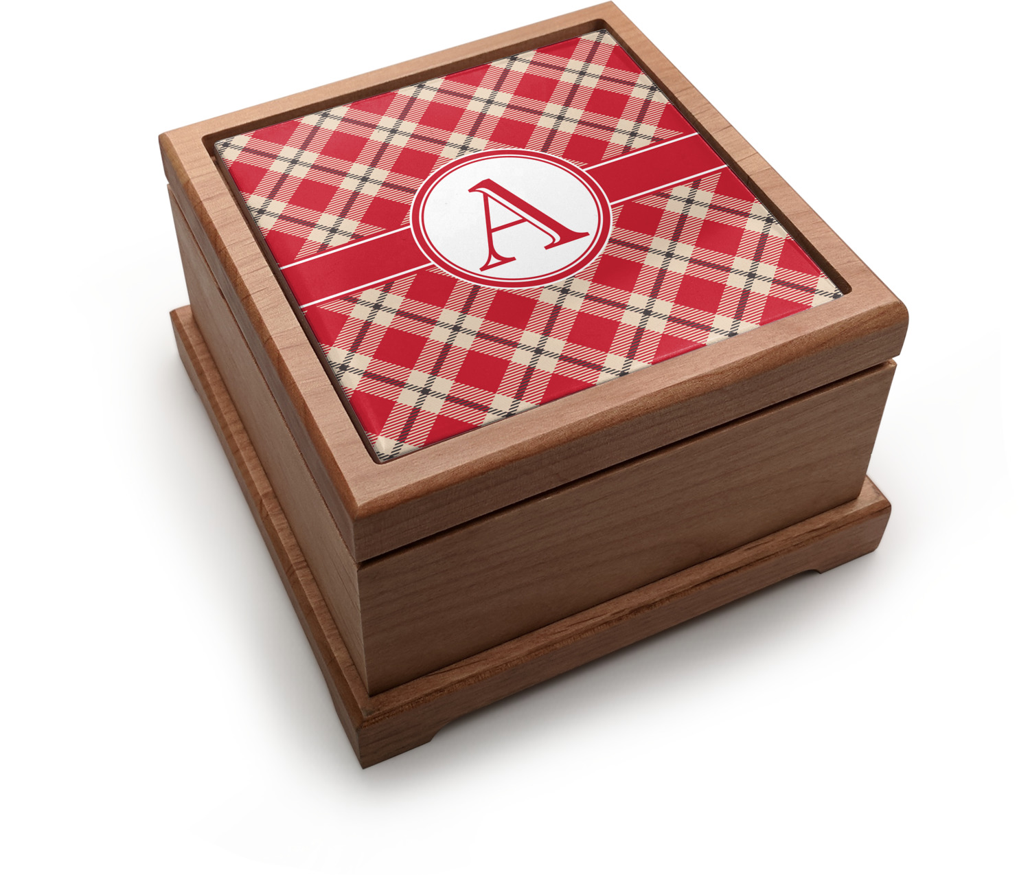 For our design, we chose a simple plaid; we chose red & tan to create a unisex palette and used dark grey for our accent color. We also chose the classic ribbon and round label with an elegant initial for our very simple, yet elegant personalization.