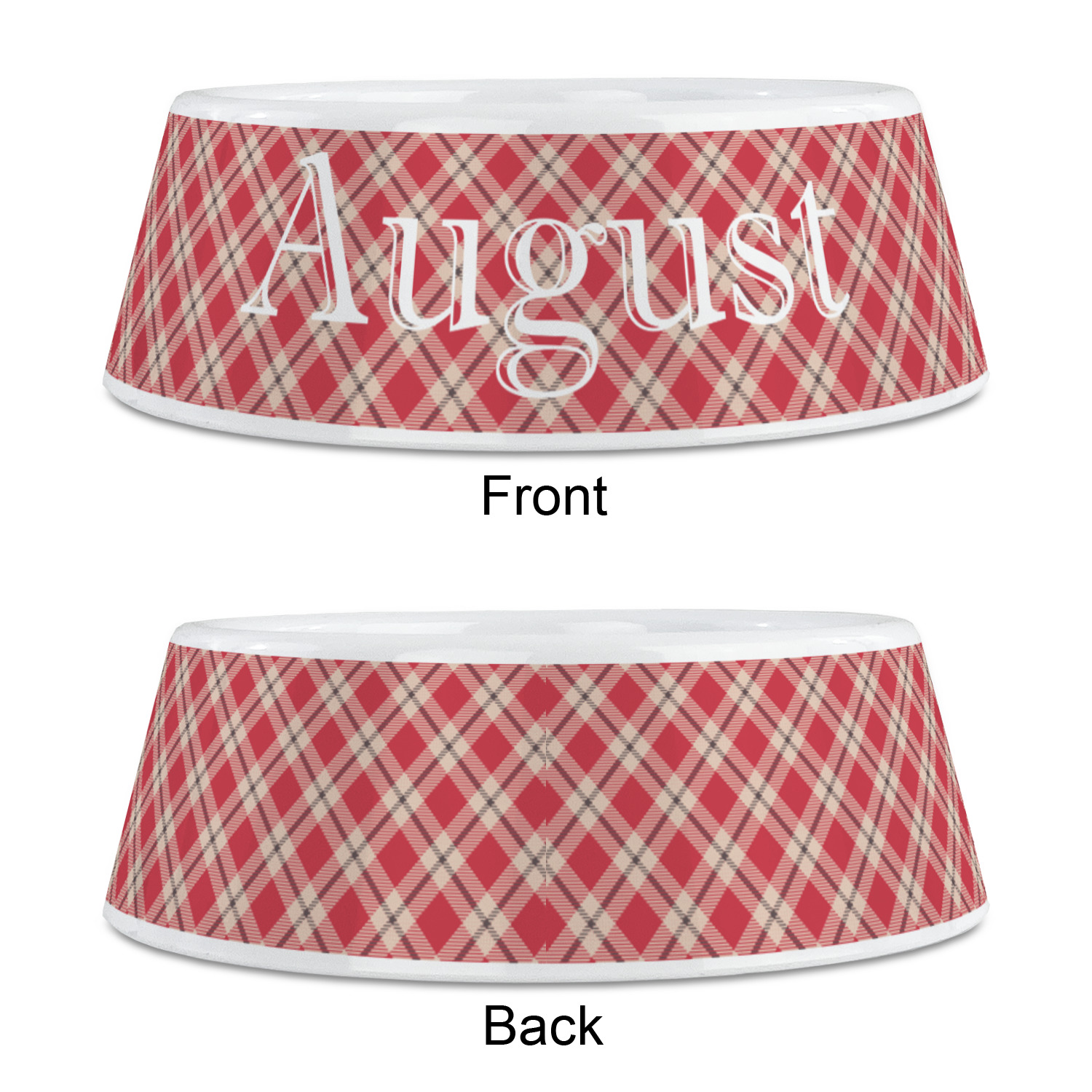 For our design, we chose a simple plaid; we chose red & tan to create a unisex palette and used dark grey for our accent color. We also chose the classic ribbon and round label with an elegant initial for our very simple, yet elegant personalization.
