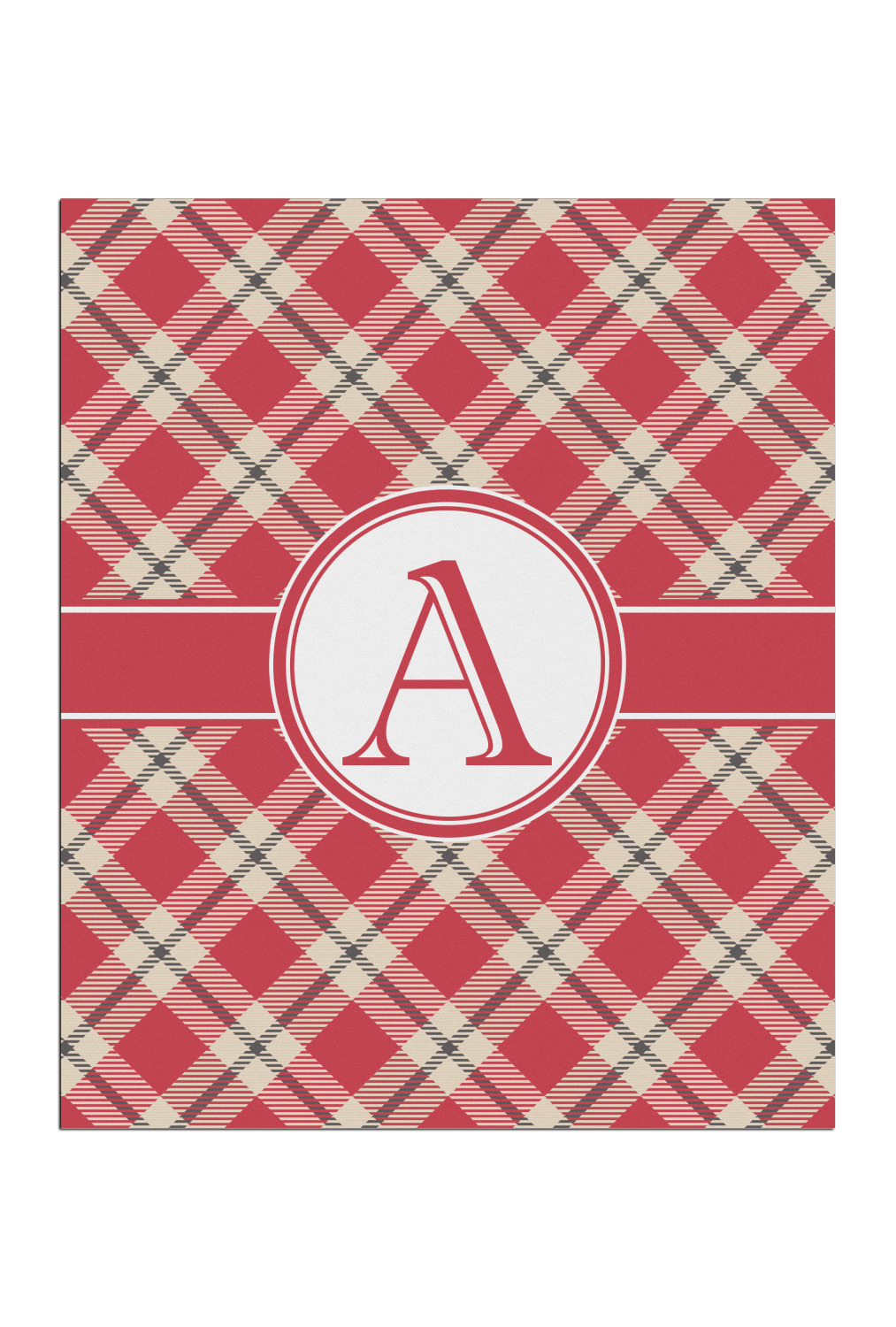 For our design, we chose a simple plaid; we chose red & tan to create a unisex palette and used dark grey for our accent color. We also chose the classic ribbon and round label with an elegant initial for our very simple, yet elegant personalization.
