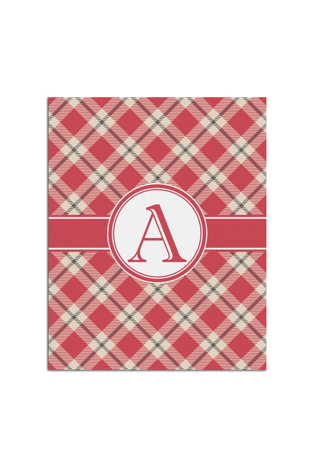 For our design, we chose a simple plaid; we chose red & tan to create a unisex palette and used dark grey for our accent color. We also chose the classic ribbon and round label with an elegant initial for our very simple, yet elegant personalization.