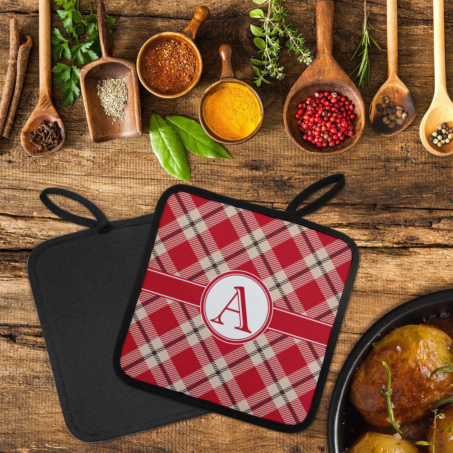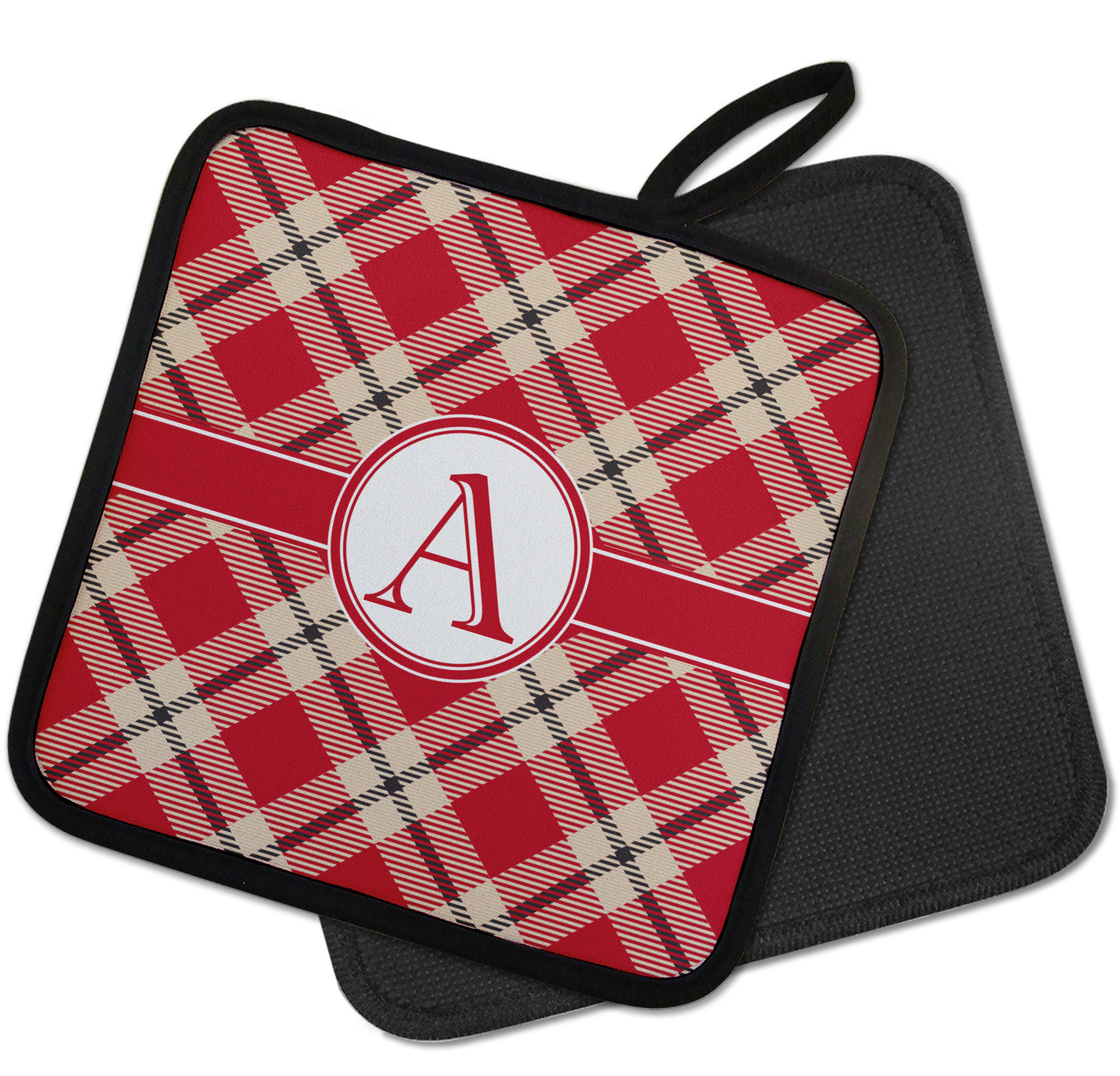 Our personalized pot holders feature a neoprene front that displays your personalization in vibrant colors. The backing of the hot pot holder is rubberized; the textured backing allows you to have a great grip when using this custom pot holder. The two materials are joined with a sleek, black trim, and the holder also includes an attached loop for hanging and storage. The pot holder is approximately 8.75 inches by 8.75 inches and 0.25 inches tall, while the fabric loop is 2.5 inches long. You can purchase a kitchen pot holder by itself or as a set of 2. We also offer a set including one pot holder and one oven mitt.