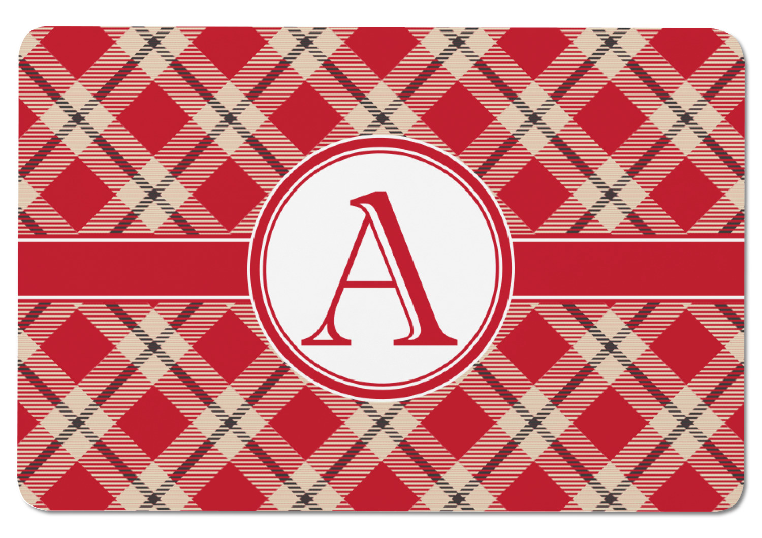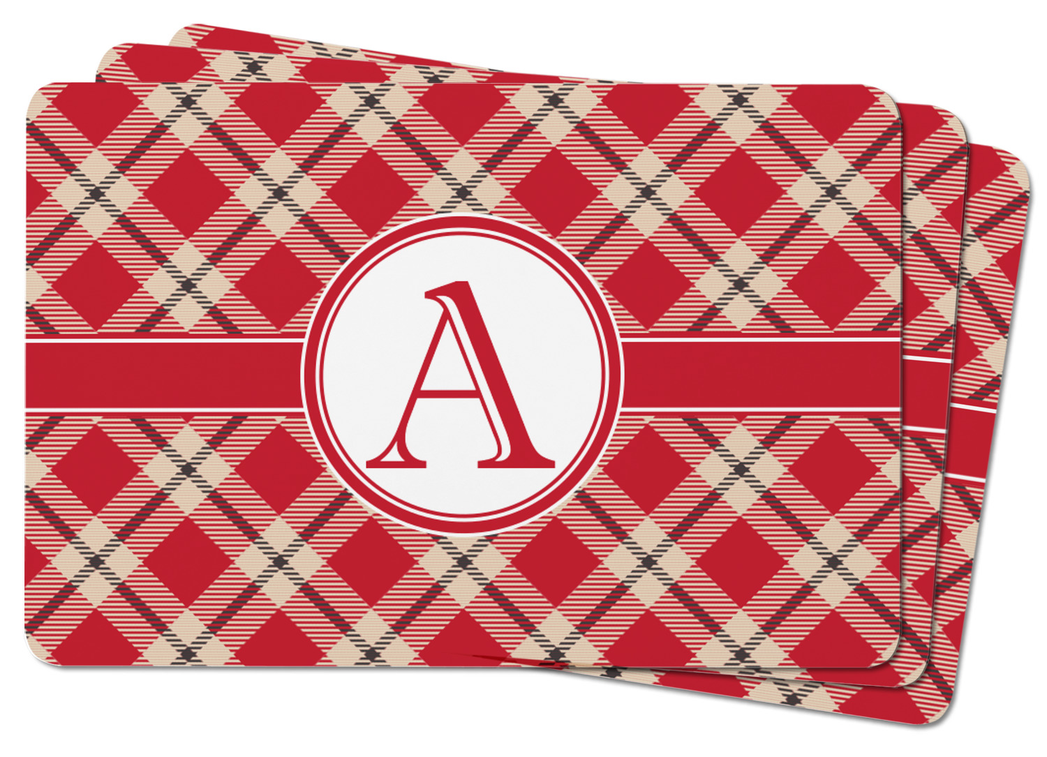 For our design, we chose a simple plaid; we chose red & tan to create a unisex palette and used dark grey for our accent color. We also chose the classic ribbon and round label with an elegant initial for our very simple, yet elegant personalization.